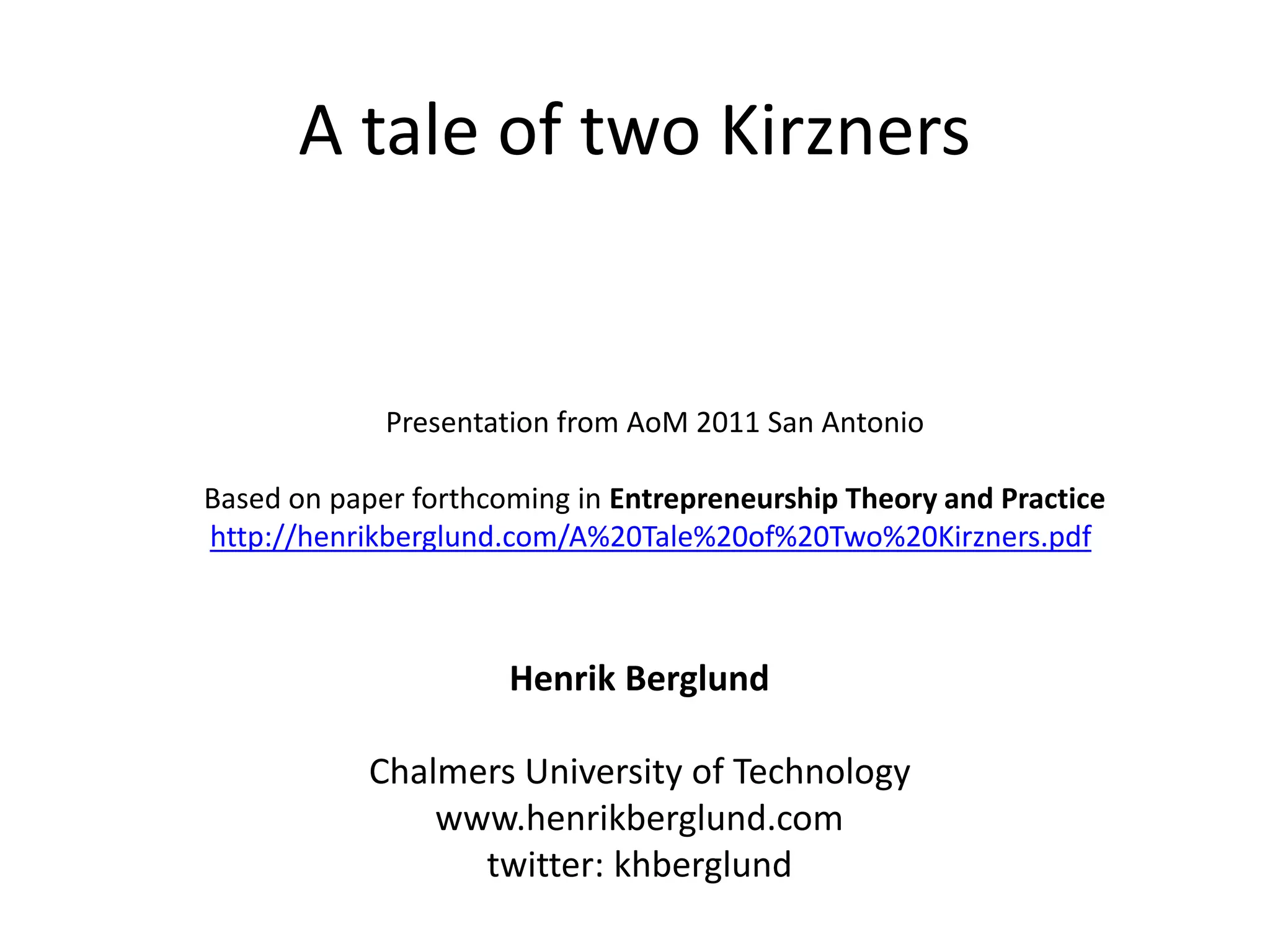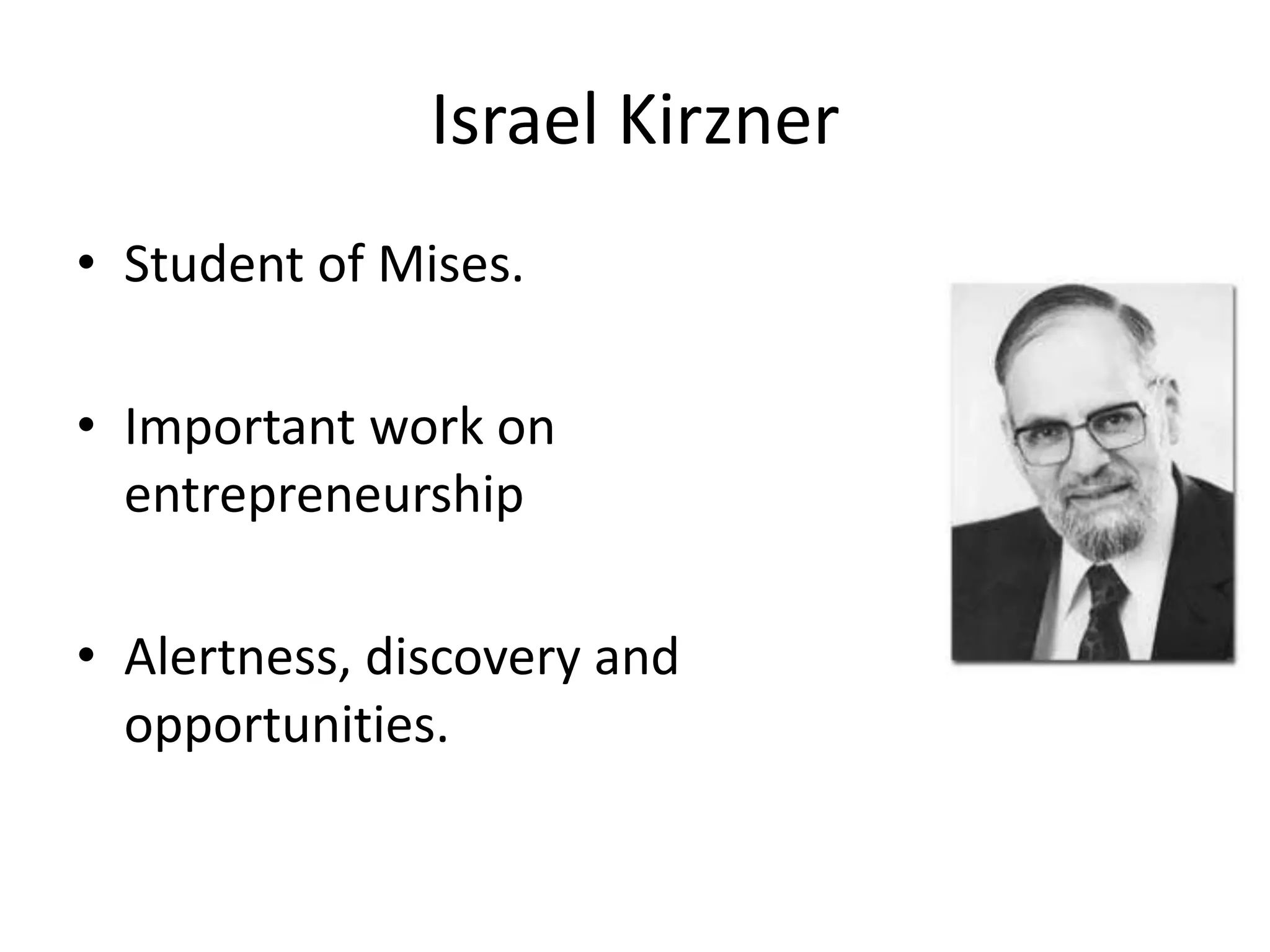 The document discusses the contributions of Israel Kirzner to entrepreneurship theory, particularly differentiating between two conceptualizations of his work: Kirzner Mark I focuses on alertness to existing arbitrage opportunities in a single time period, while Kirzner Mark II incorporates multiple time periods and emphasizes creativity amid uncertainty. Both perspectives highlight the role of entrepreneurial alertness but illustrate distinct nuances in understanding opportunities and their subjective nature. The document further explores the implications of these concepts within the Austrian economics tradition and their potential as a foundation for empirical research.