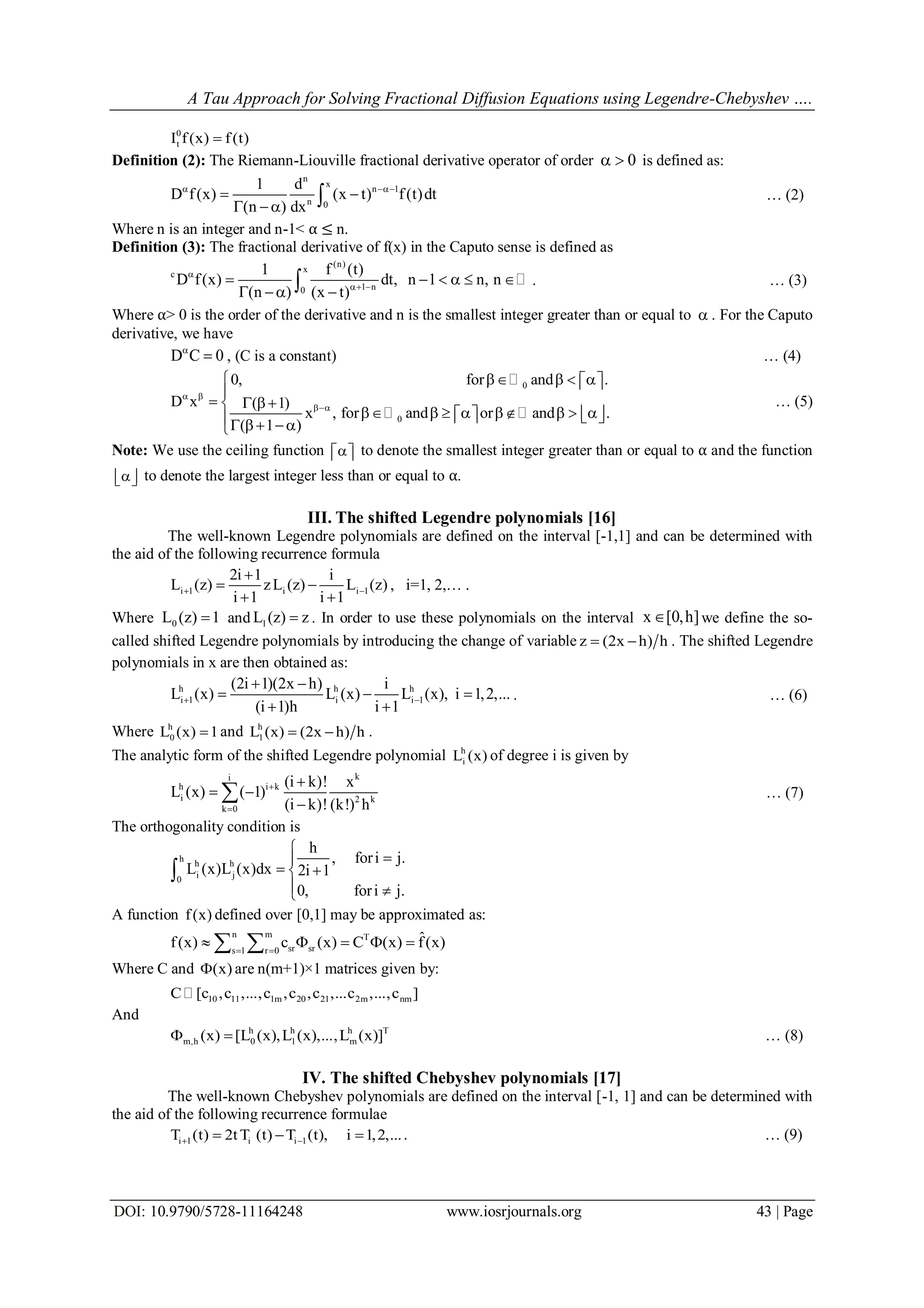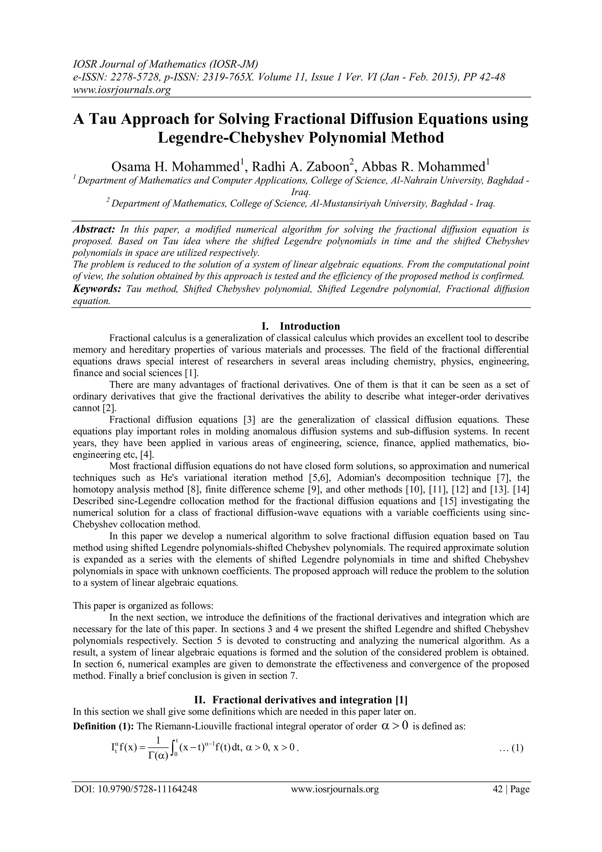 This document presents a modified numerical algorithm for solving fractional diffusion equations using a tau method with shifted Legendre and Chebyshev polynomials. The proposed method reduces the problem to solving a system of linear algebraic equations, and its efficiency is demonstrated through various numerical examples. The paper also provides definitions and analyses of fractional derivatives and polynomials used in the method.