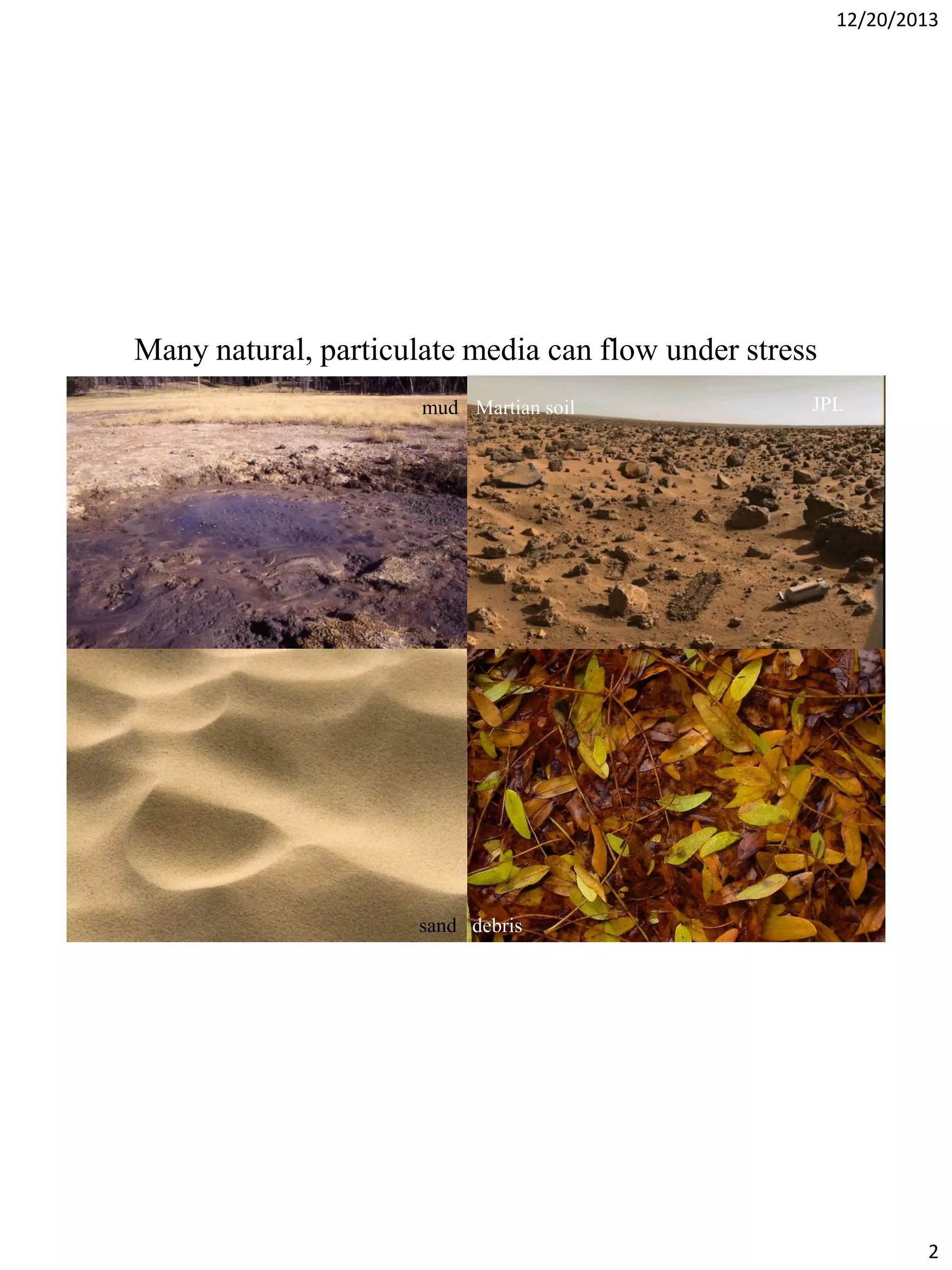 The document discusses terradynamics for legged locomotion on granular media, addressing the challenges posed by granular substrates and the complexity of limb-ground interactions. It presents a resistive force model that predicts locomotion performance without fitting parameters and compares various simulation methods, including discrete element methods and multi-body dynamics. The findings suggest that the resistive force model is effective and much faster than traditional methods for predicting performance in granular environments.