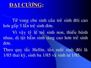 Tài liệu đề cập đến các vấn đề liên quan đến thai nhi trong trường hợp sinh đôi, bao gồm tỉ lệ tử vong, các loại thai đôi và những biến chứng có thể xảy ra. Nó giải thích các quy tắc liên quan đến sinh đôi và cung cấp thông tin về quản lý y tế cần thiết trong trường hợp các thai nhi gặp vấn đề như nhau hay bị dính nhau. Cuối cùng, tài liệu nêu rõ sự cần thiết phải theo dõi và chăm sóc y tế định kỳ để phát hiện sớm các vấn đề sức khỏe cho mẹ và thai nhi.