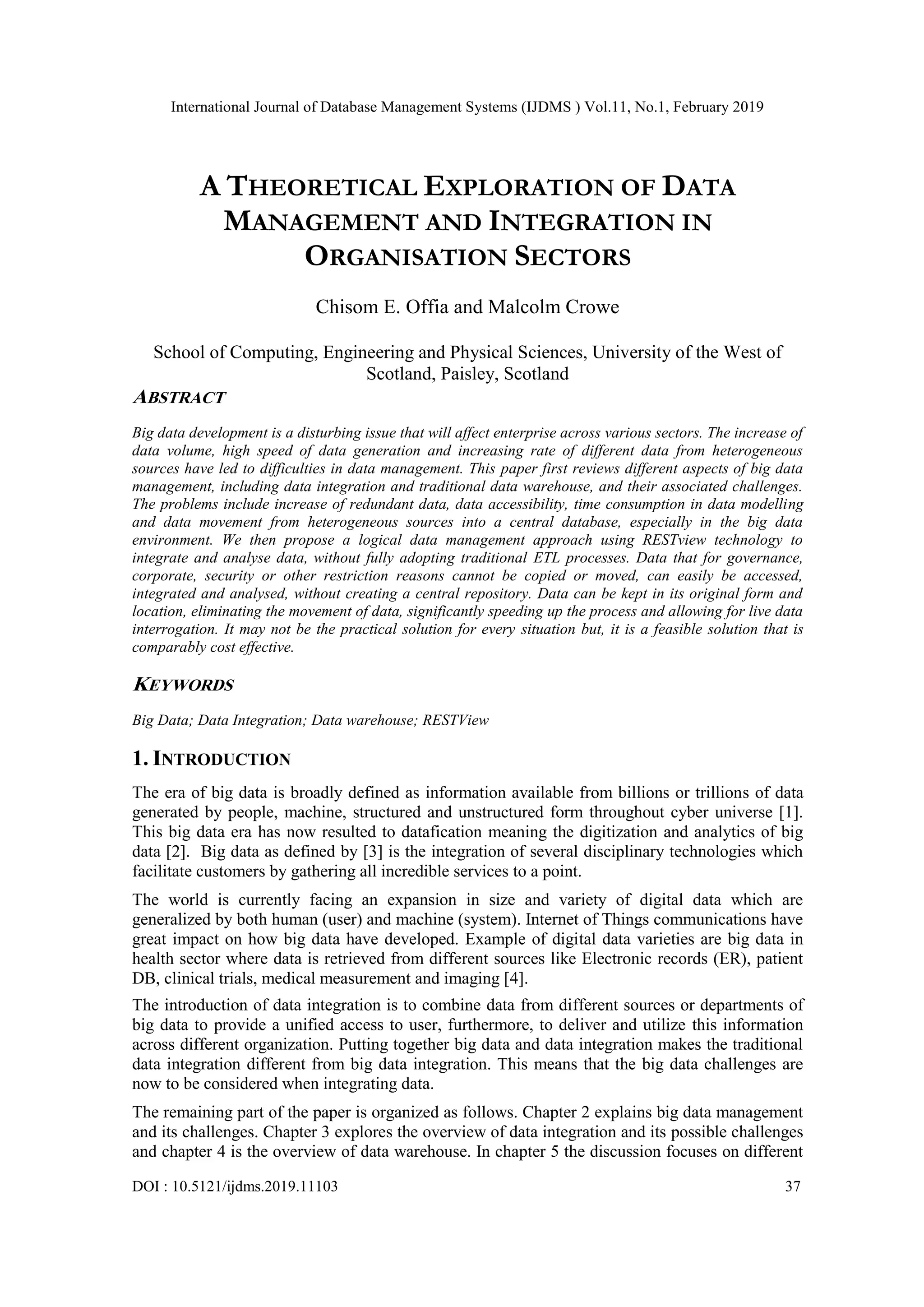 Big data development is a disturbing issue that will affect enterprise across various sectors. The increase of data volume, high speed of data generation and increasing rate of different data from heterogeneous sources have led to difficulties in data management. This paper first reviews different aspects of big data management, including data integration and traditional data warehouse, and their associated challenges. The problems include increase of redundant data, data accessibility, time consumption in data modelling and data movement from heterogeneous sources into a central database, especially in the big data environment. We then propose a logical data management approach using RESTview technology to integrate and analyse data, without fully adopting traditional ETL processes. Data that for governance, corporate, security or other restriction reasons cannot be copied or moved, can easily be accessed, integrated and analysed, without creating a central repository. Data can be kept in its original form and location, eliminating the movement of data, significantly speeding up the process and allowing for live data interrogation. It may not be the practical solution for every situation but, it is a feasible solution that is comparably cost effective.