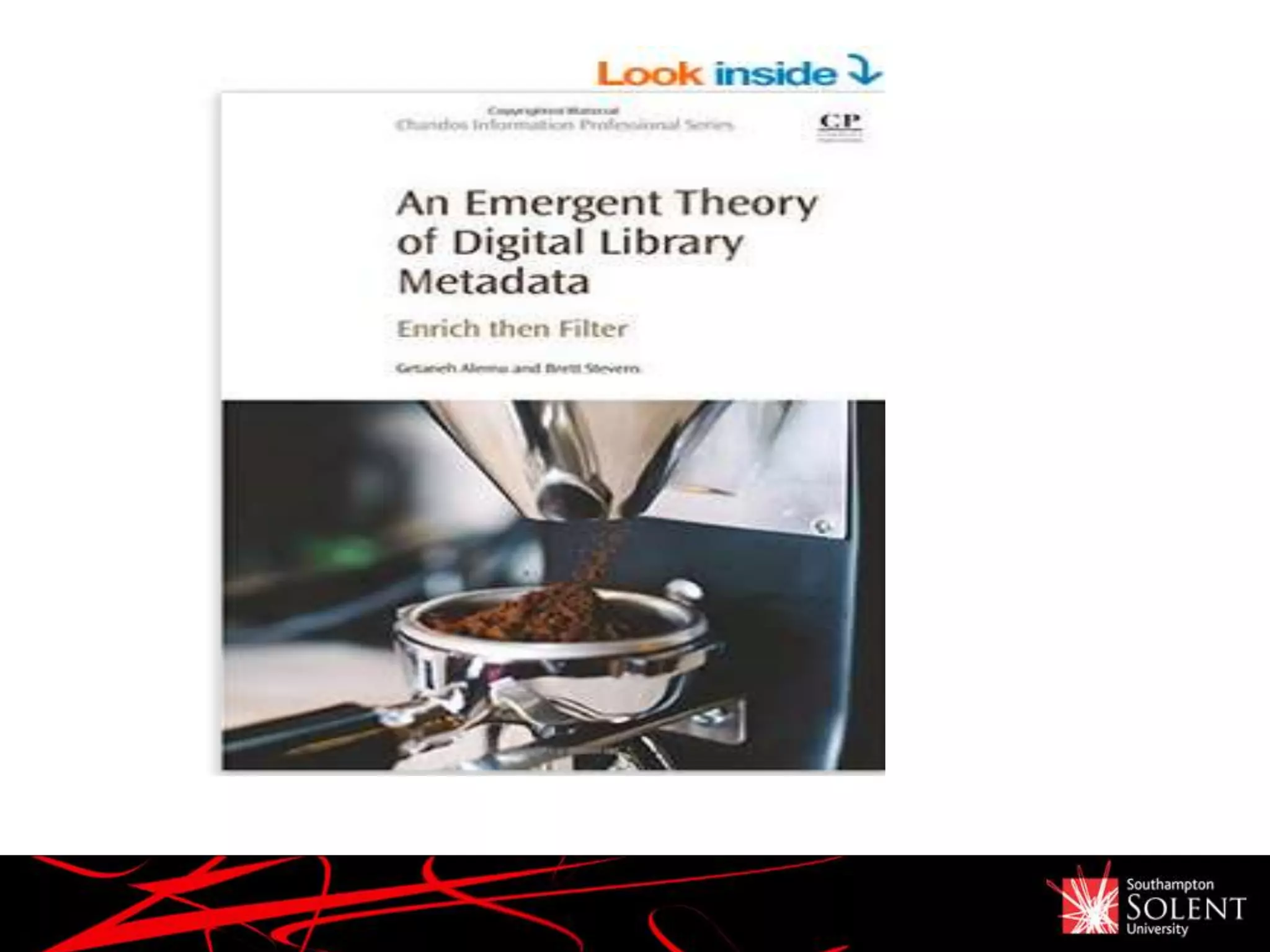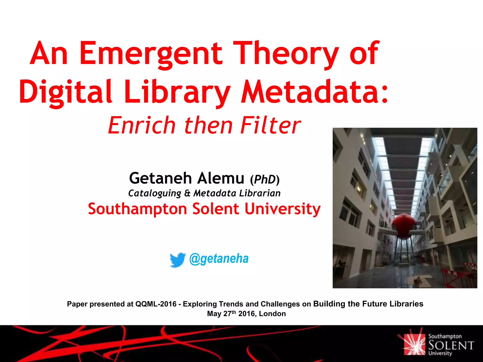 The document presents a theory of enriching digital library metadata through a social constructivist approach, then filtering it for users. It discusses limitations of current standards-based approaches and the need to incorporate socially constructed metadata. The theory is based on interviews with 57 librarians, students, and lecturers. It proposes separating metadata content enrichment, as a continuous process, from interface filtering. Enrichment should move from user-centered to user-driven and involve diverse metadata that better meets users' needs through seamless linking. The goal is "useful" rather than "perfect" metadata, with post-hoc user-driven filtering. The presenter provides an example of implementing this theory at Southampton Solent University Library.