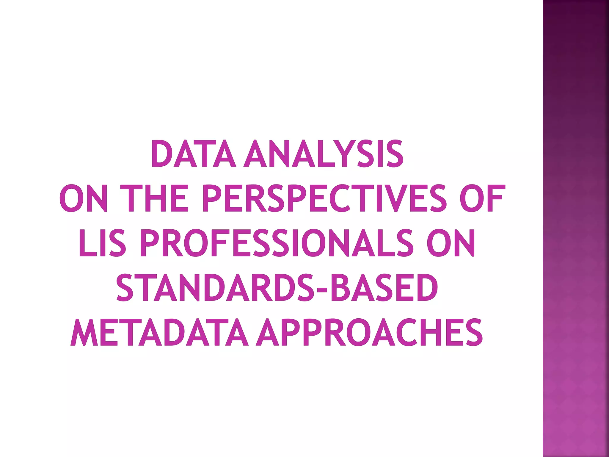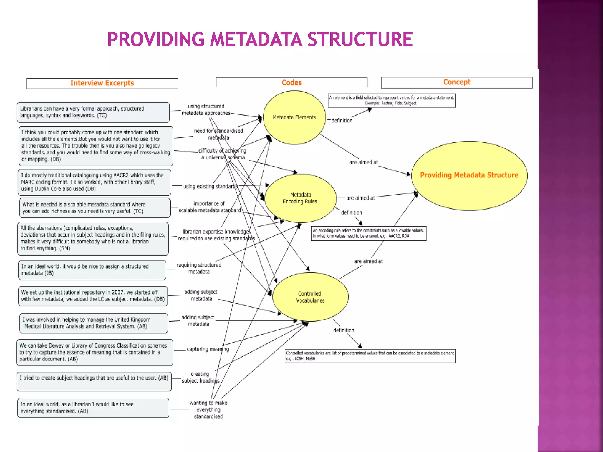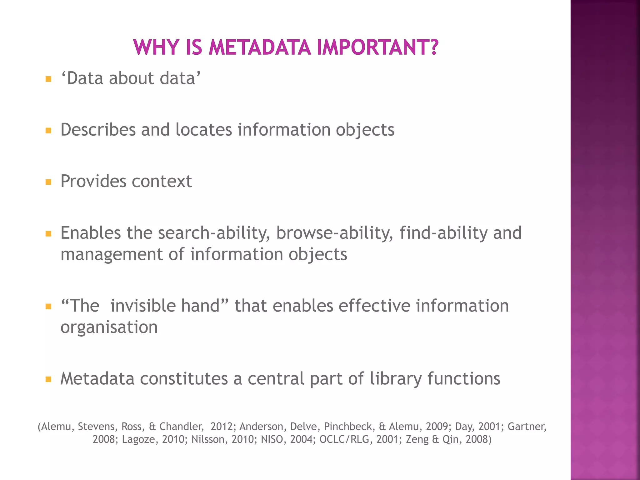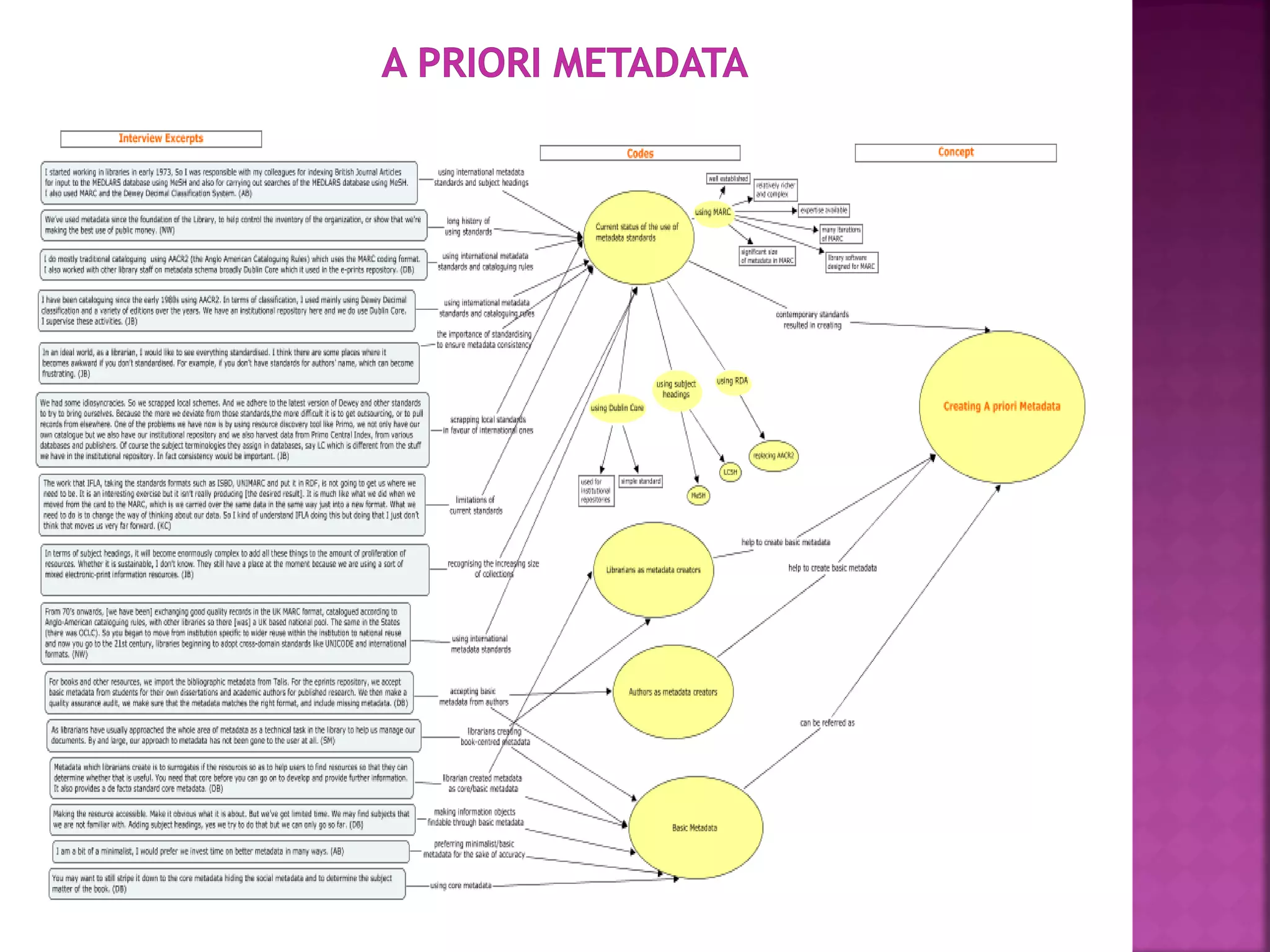 The document discusses the role of metadata in information organization within libraries, highlighting its context, searchability, and management capabilities. It criticizes contemporary metadata approaches for not adequately capturing the semantic aspects of information objects and points to the importance of user-driven, socially-constructed metadata. The study emphasizes the need for theoretical frameworks and includes findings from interviews with various library professionals to explore metadata interoperability and related challenges.