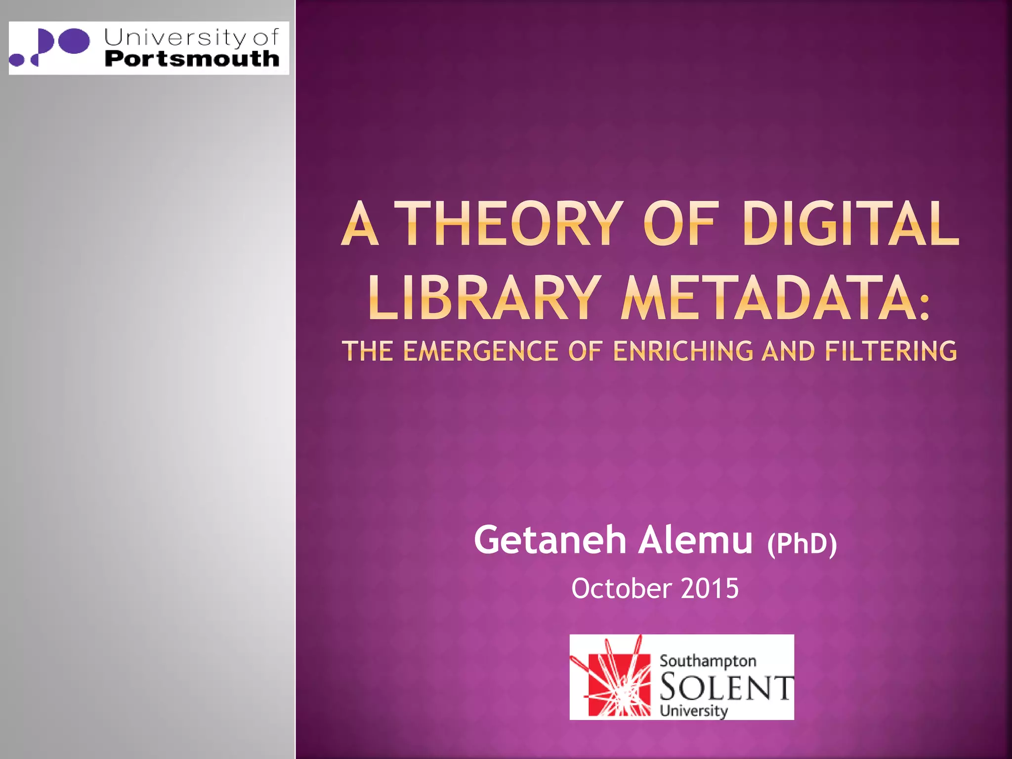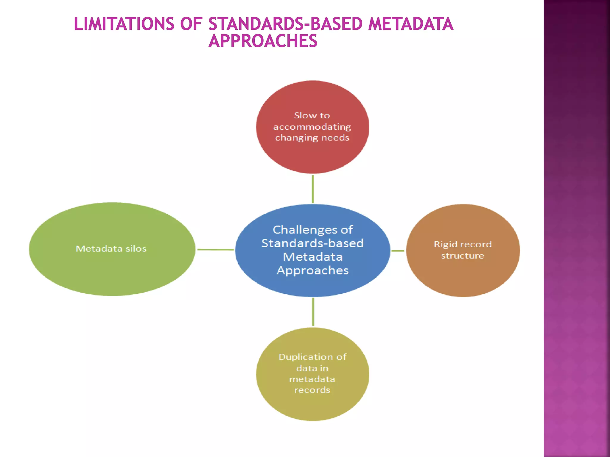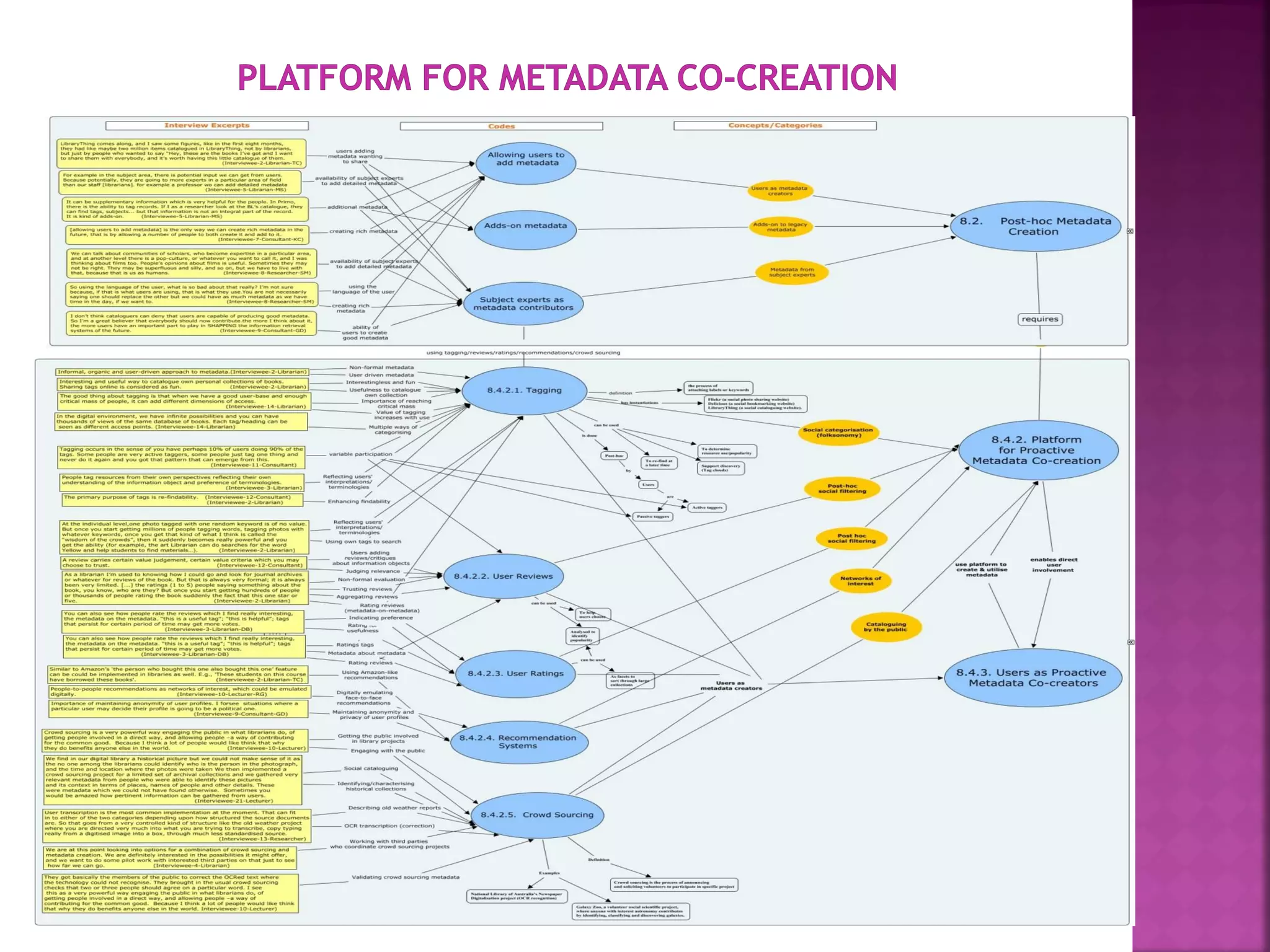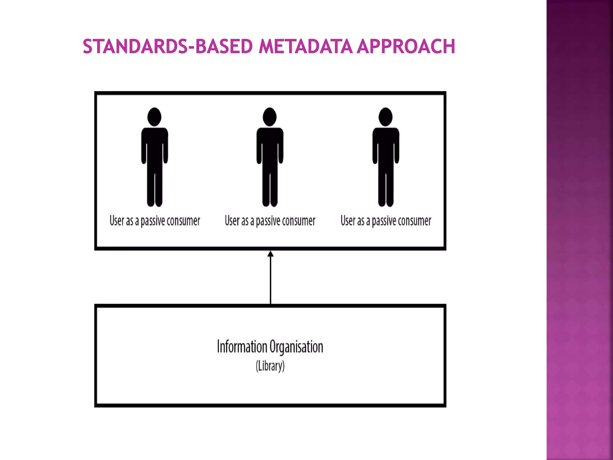 The document discusses the role of metadata in information organization within libraries, highlighting its context, searchability, and management capabilities. It criticizes contemporary metadata approaches for not adequately capturing the semantic aspects of information objects and points to the importance of user-driven, socially-constructed metadata. The study emphasizes the need for theoretical frameworks and includes findings from interviews with various library professionals to explore metadata interoperability and related challenges.