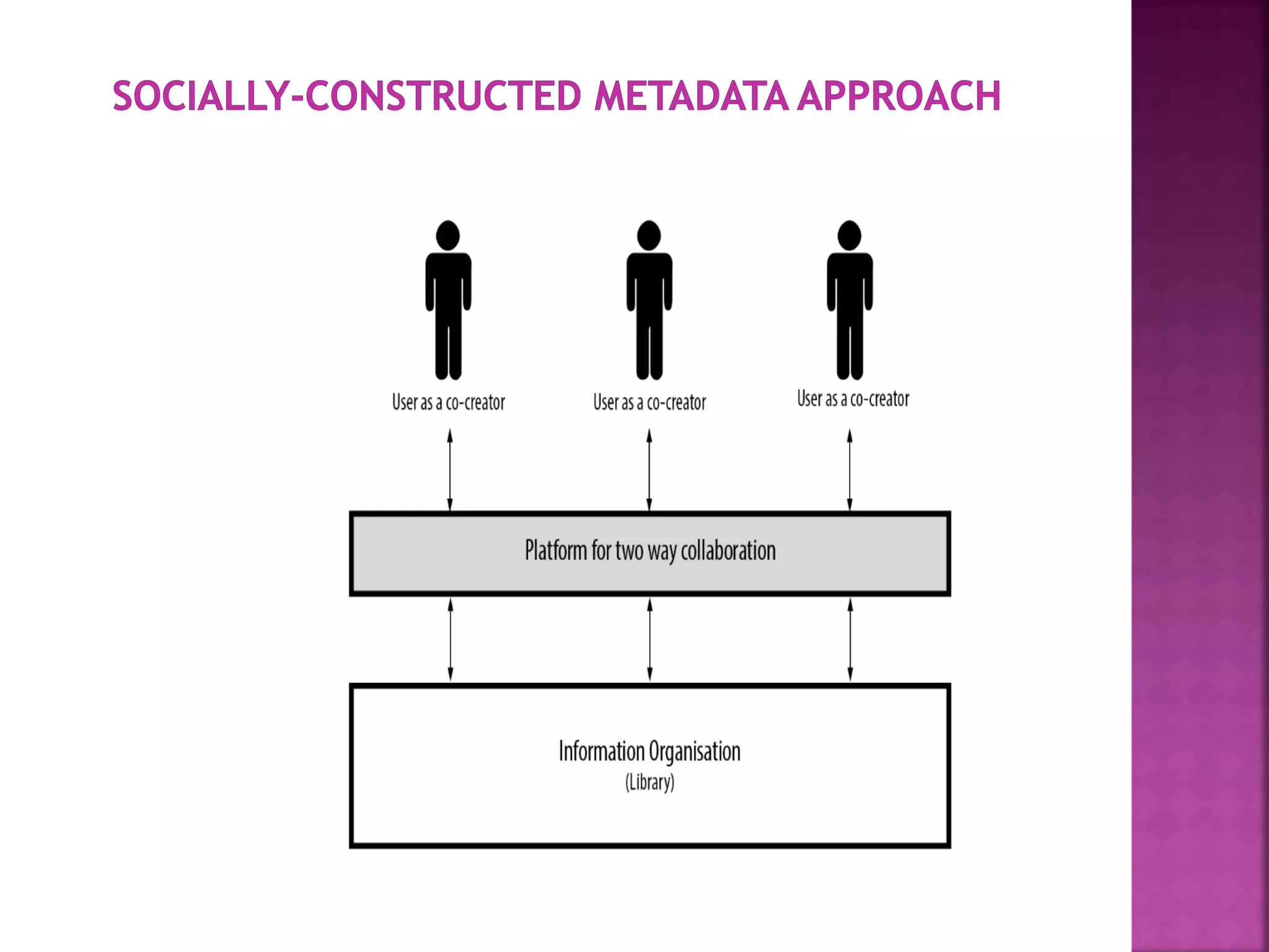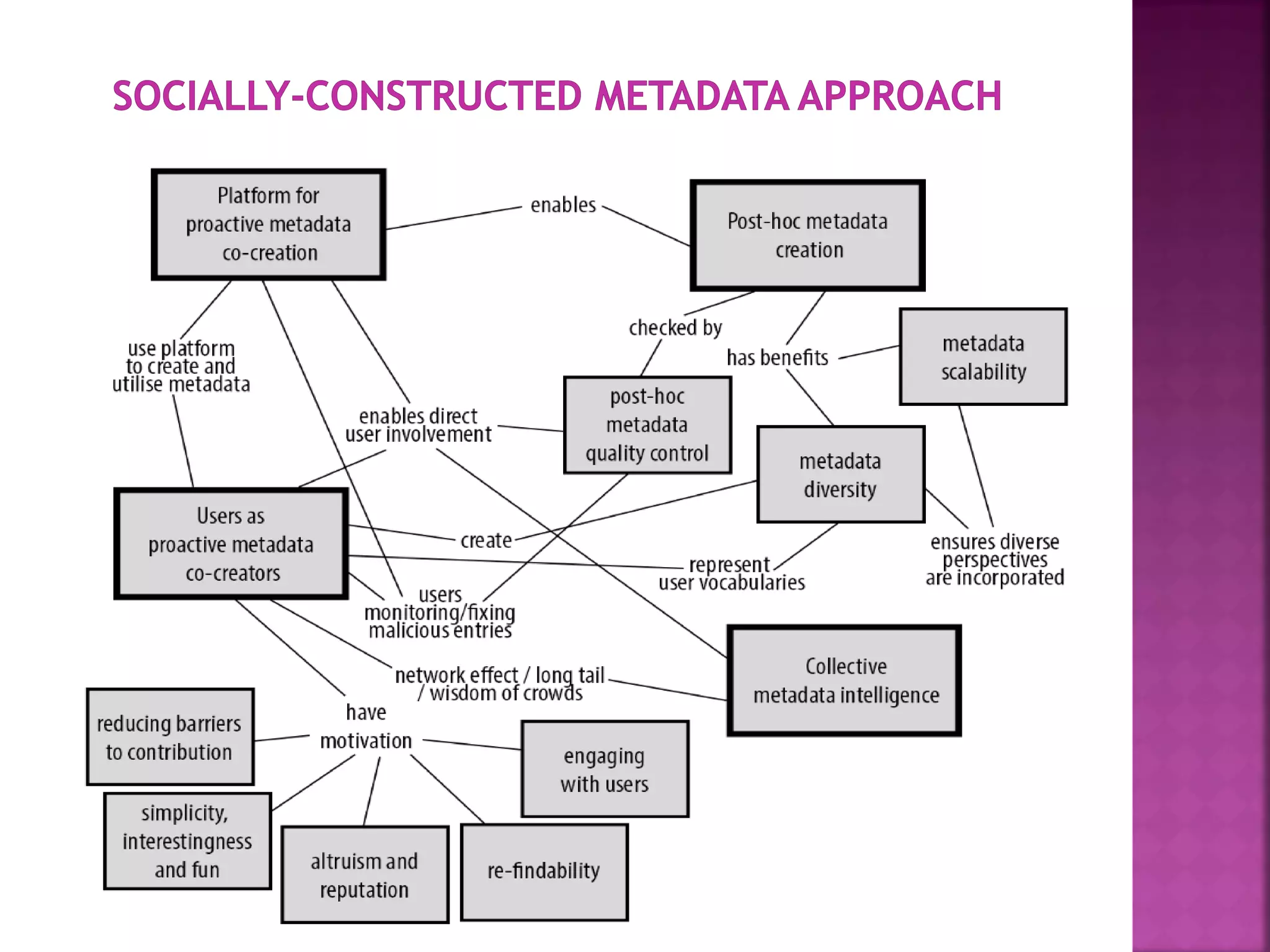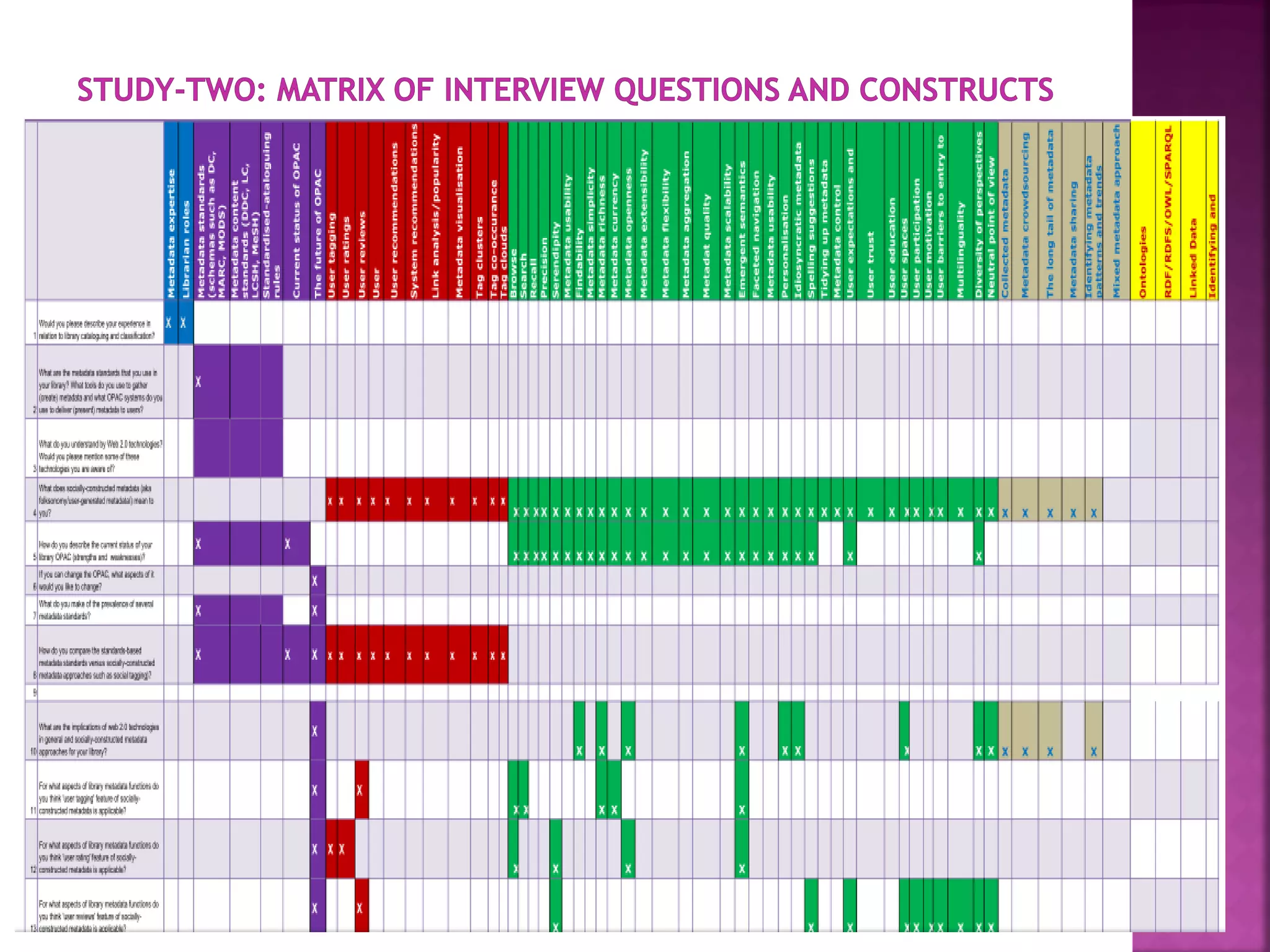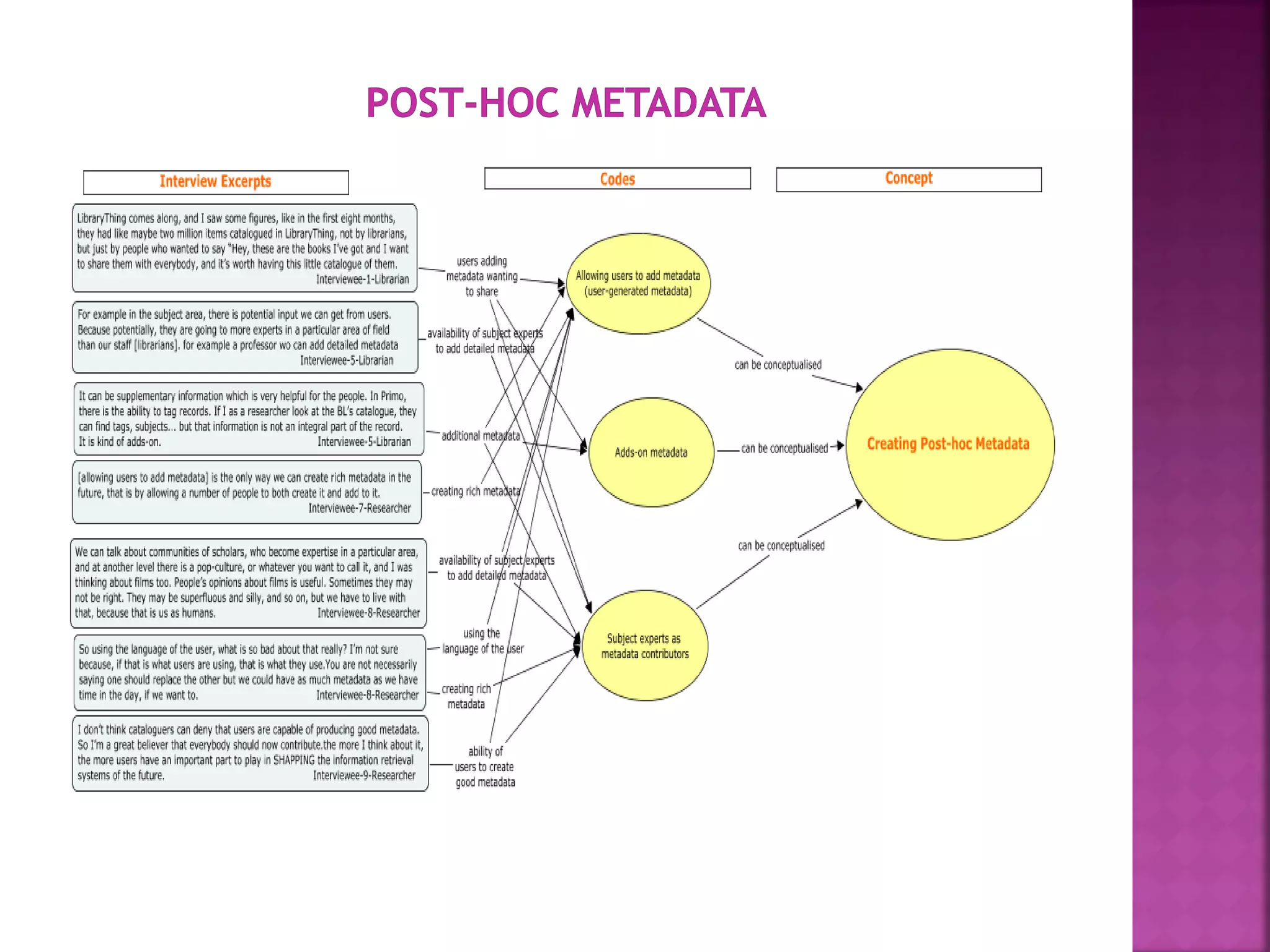 The document discusses the role of metadata in information organization within libraries, highlighting its context, searchability, and management capabilities. It criticizes contemporary metadata approaches for not adequately capturing the semantic aspects of information objects and points to the importance of user-driven, socially-constructed metadata. The study emphasizes the need for theoretical frameworks and includes findings from interviews with various library professionals to explore metadata interoperability and related challenges.