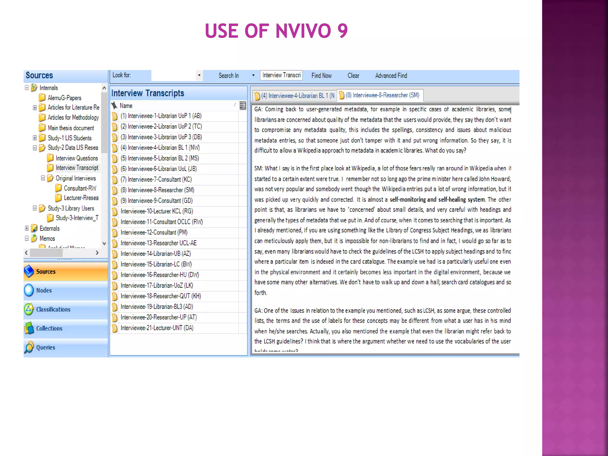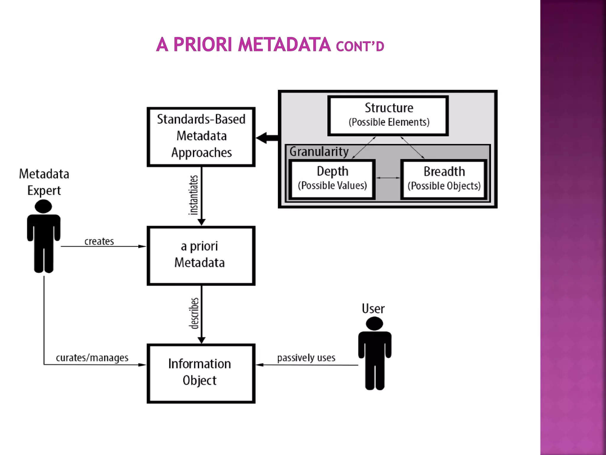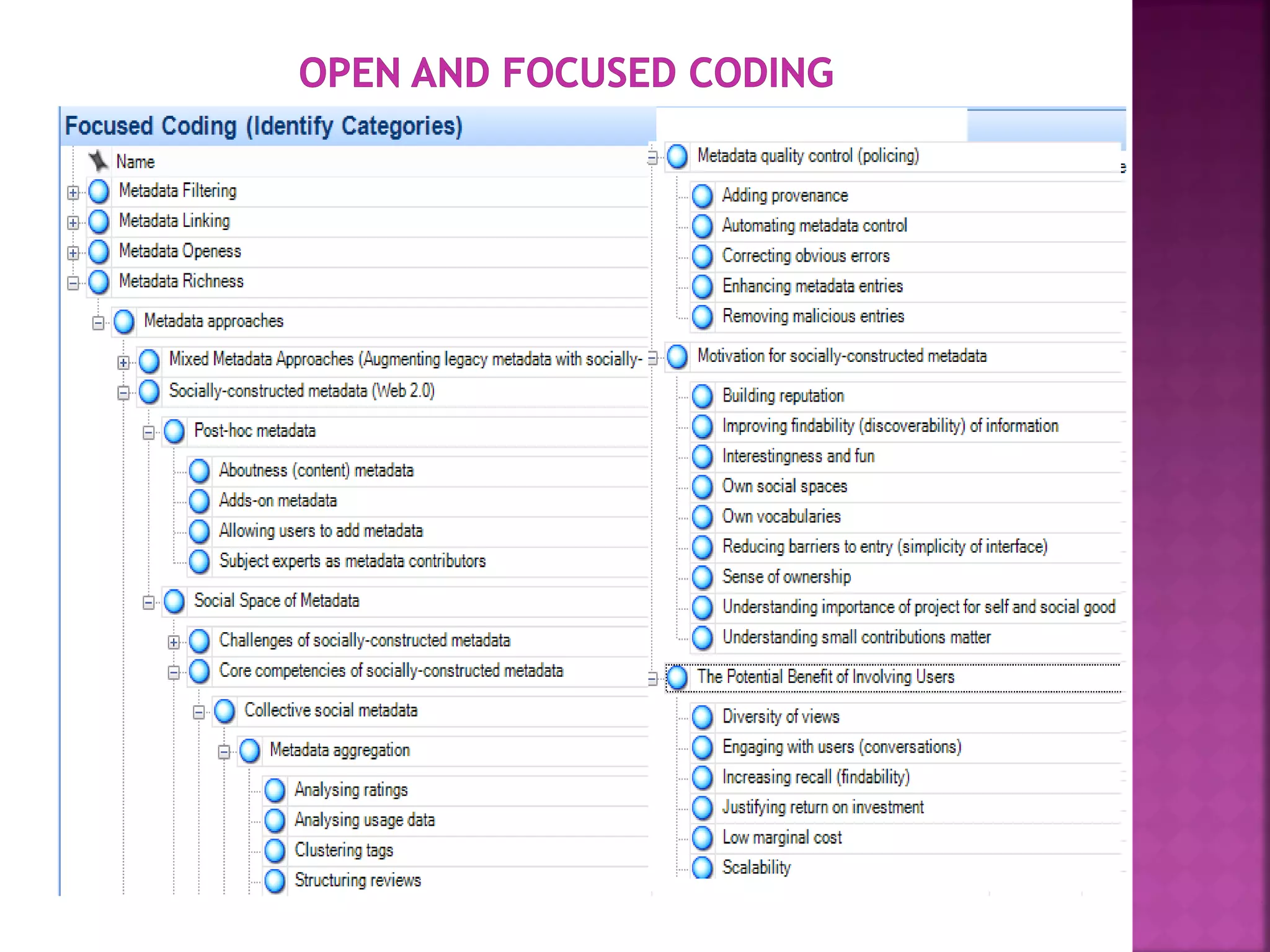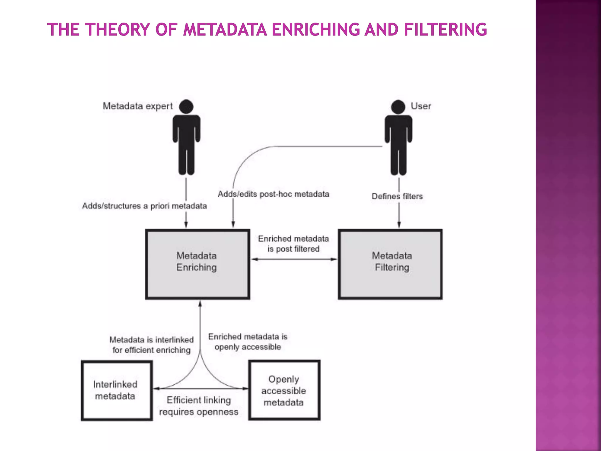 The document discusses the role of metadata in information organization within libraries, highlighting its context, searchability, and management capabilities. It criticizes contemporary metadata approaches for not adequately capturing the semantic aspects of information objects and points to the importance of user-driven, socially-constructed metadata. The study emphasizes the need for theoretical frameworks and includes findings from interviews with various library professionals to explore metadata interoperability and related challenges.