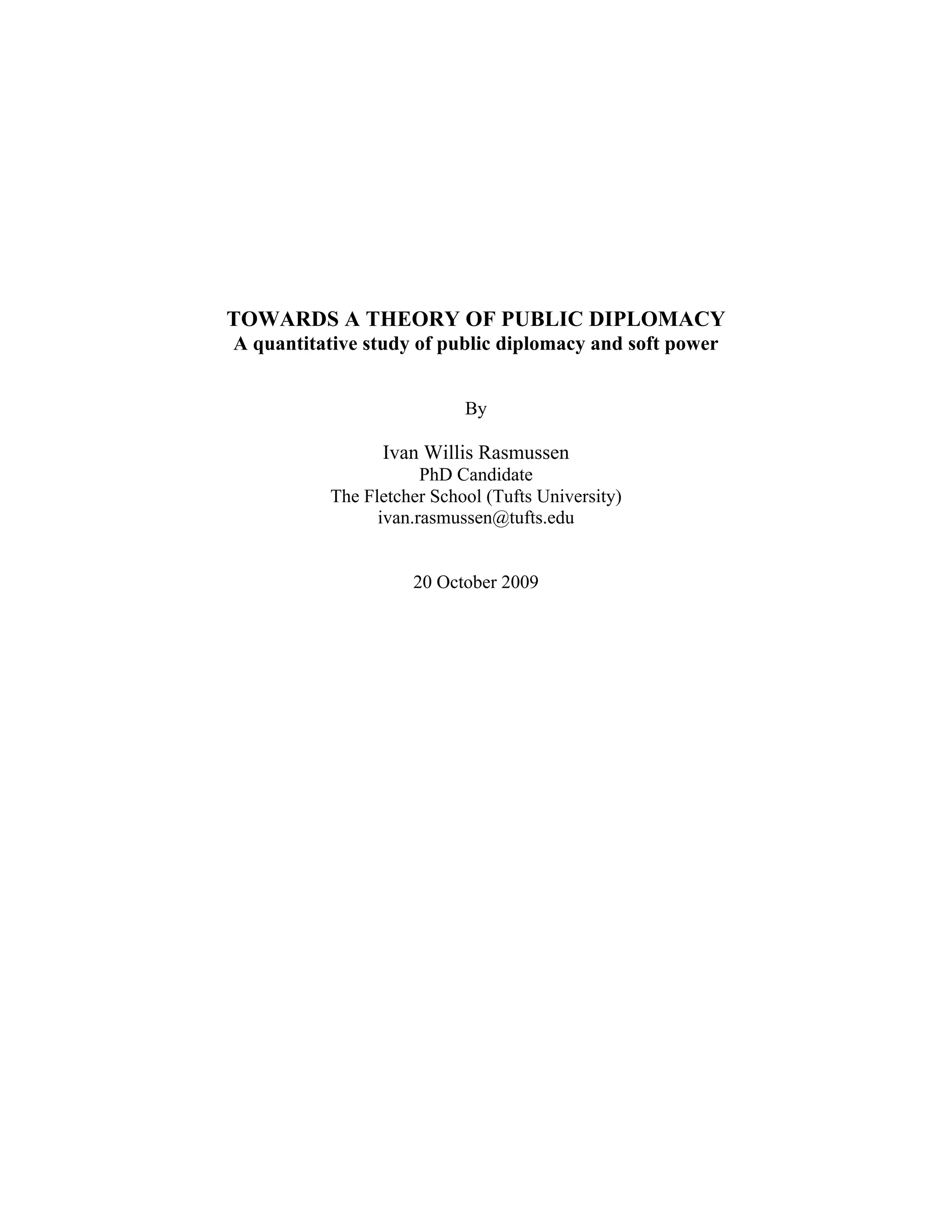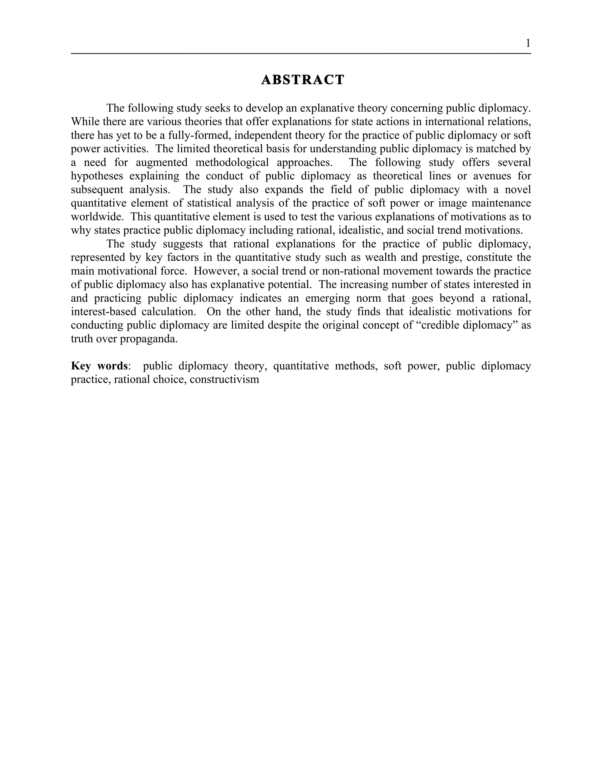 This document provides an abstract for a study on developing a theory of public diplomacy. It aims to test different explanations for why states practice public diplomacy, including rational, idealistic, and social trend motivations, using a novel quantitative method and statistical analysis. The study finds that rational explanations related to factors like wealth and prestige best explain public diplomacy activities. However, it also finds evidence that a social trend or norm is emerging as more states participate in public diplomacy beyond rational calculations. Idealistic motivations are found to have limited explanatory power despite concepts of "credible diplomacy." The document outlines the theoretical background and emergence of public diplomacy as a field of study.