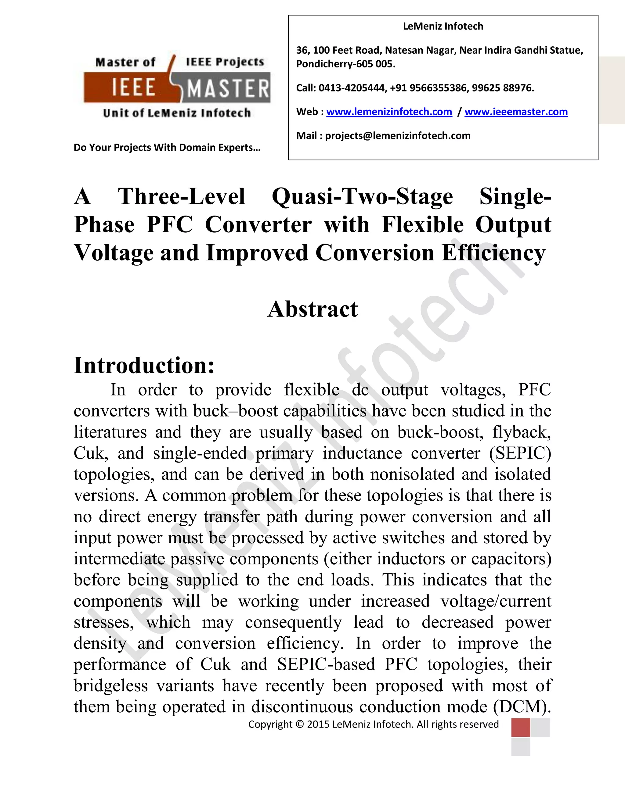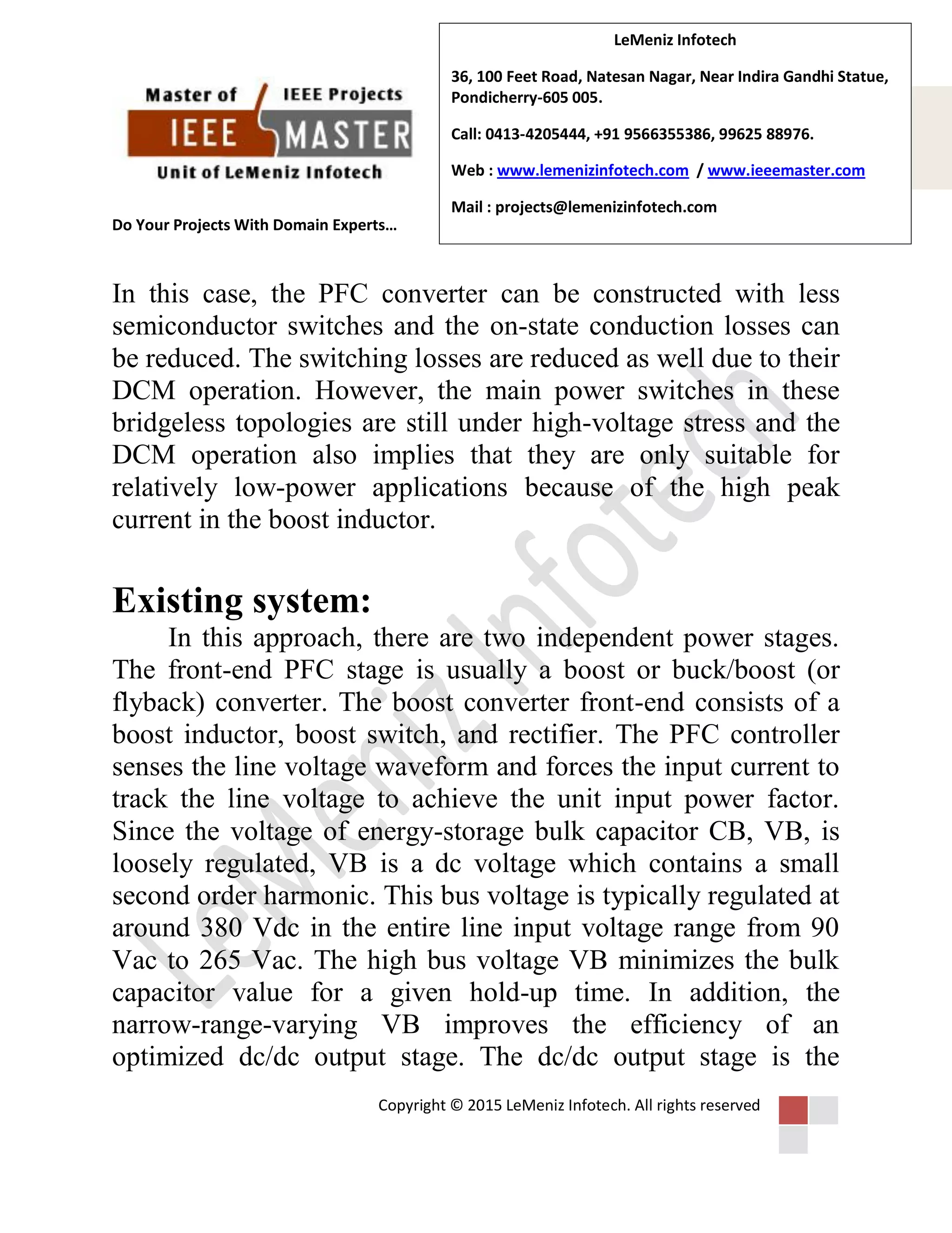 The document presents a high-efficiency single-phase power factor correction (PFC) converter designed for flexible output voltage and improved efficiency. It discusses the common challenges with existing PFC topologies and introduces a proposed system that reduces switching losses and offers a sinusoidal input current. Applications include plug-in charging from the power grid, vehicle-to-grid discharge, and driving electric motors.