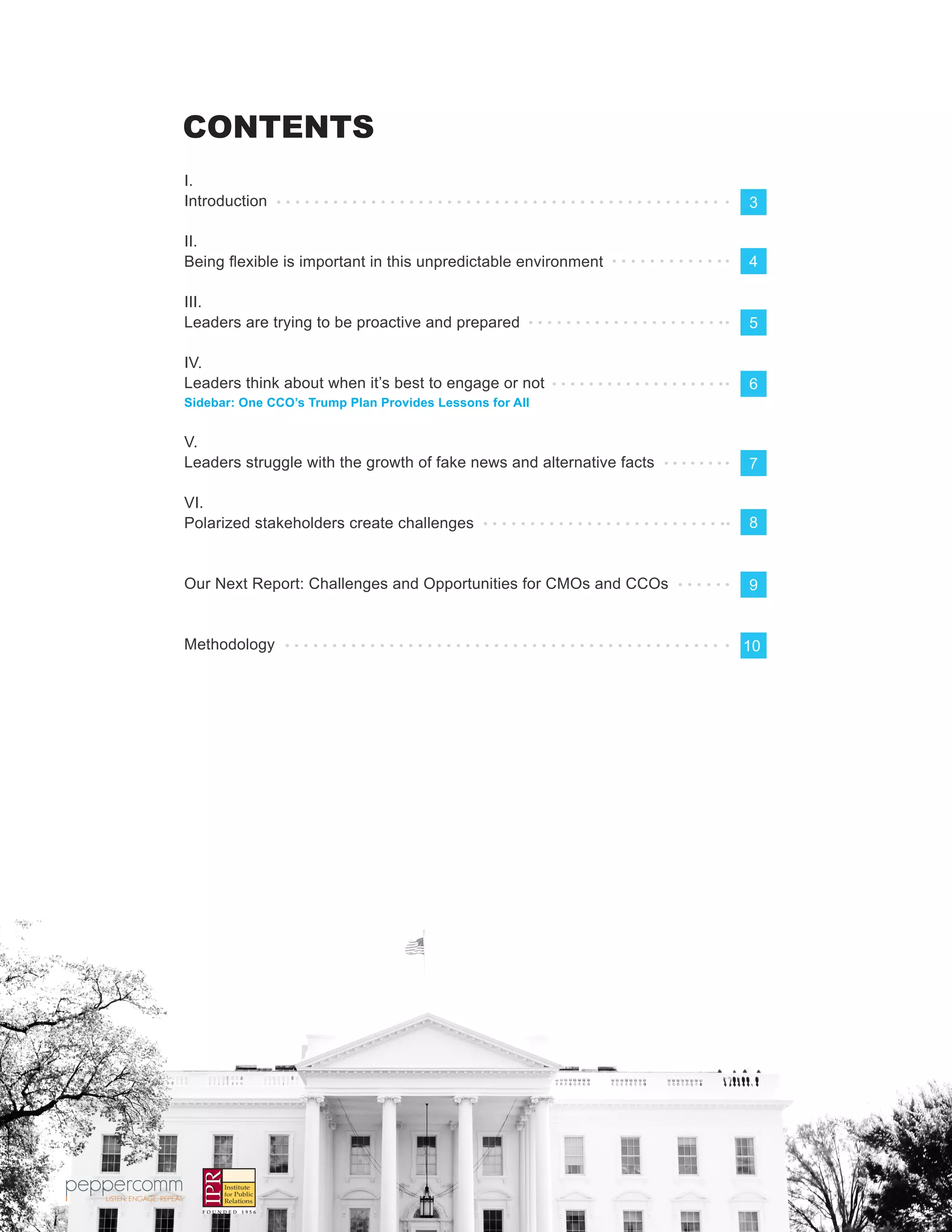 This document examines how communications and marketing executives are adapting to the challenges posed by the Trump administration, highlighting themes such as the need for flexibility, proactive engagement, and the impact of misinformation. Interviewees discussed their strategies for mitigating reputational risks and navigating polarized stakeholder responses amid the rise of fake news. The findings suggest that these leaders are focused on preparing their organizations for rapid responses to unforeseen issues related to political discourse and executive actions.