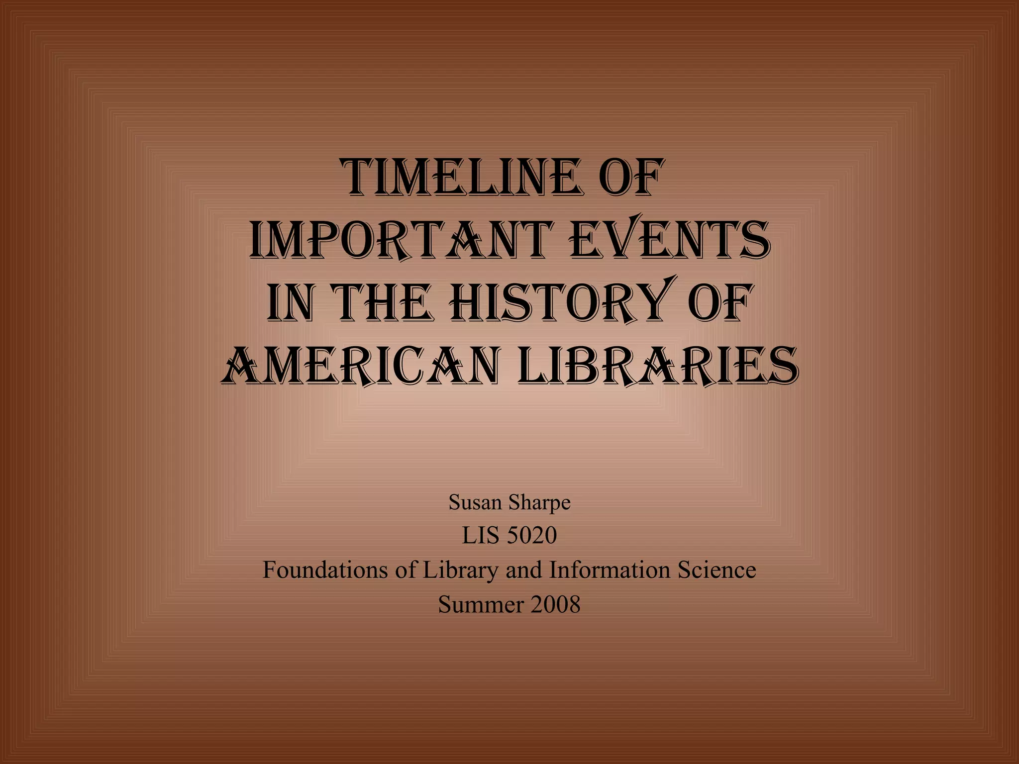 The document provides a timeline of important events in the history of American libraries from 1731 to 1967. It summarizes key developments such as Benjamin Franklin opening the first subscription library in 1731, the burning of the Library of Congress in 1814 and Thomas Jefferson subsequently selling his personal library to replace it, the Morrill Land Grant Act of 1862 establishing land grant colleges and academic libraries, and the establishment of the first library school by Melvil Dewey in 1887.