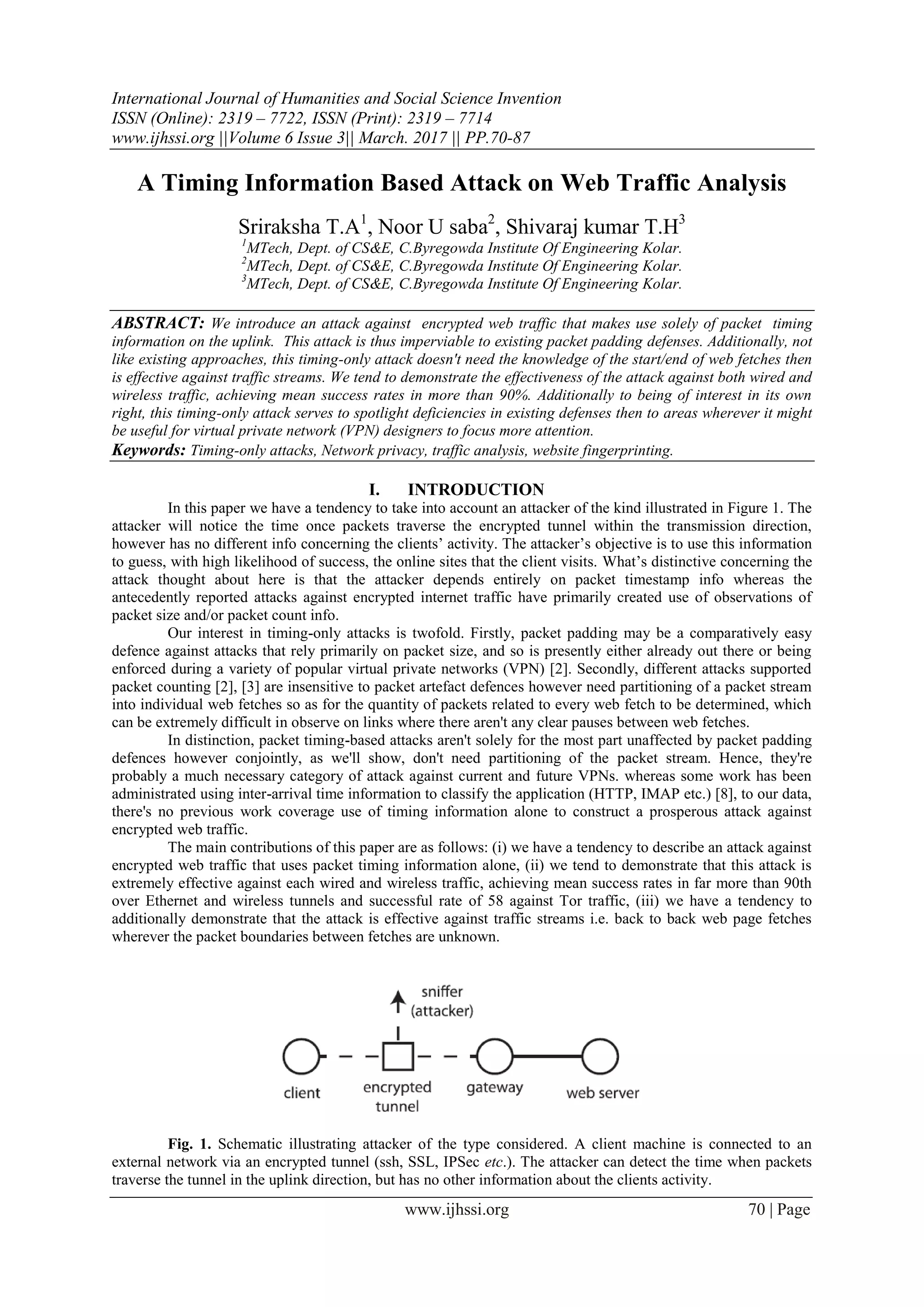 This document describes a timing-only attack on encrypted web traffic that uses solely the timing information of packets traversing an encrypted tunnel. The attack aims to identify the websites visited by a client based only on analyzing the timestamps of packets in the uplink direction. The attack is effective against both wired and wireless traffic, achieving over 90% success rates. It does not require knowledge of packet sizes, directions, or boundaries between individual web page fetches. The timing patterns of packet timestamps contain distinguishing information that can be used to fingerprint different websites.