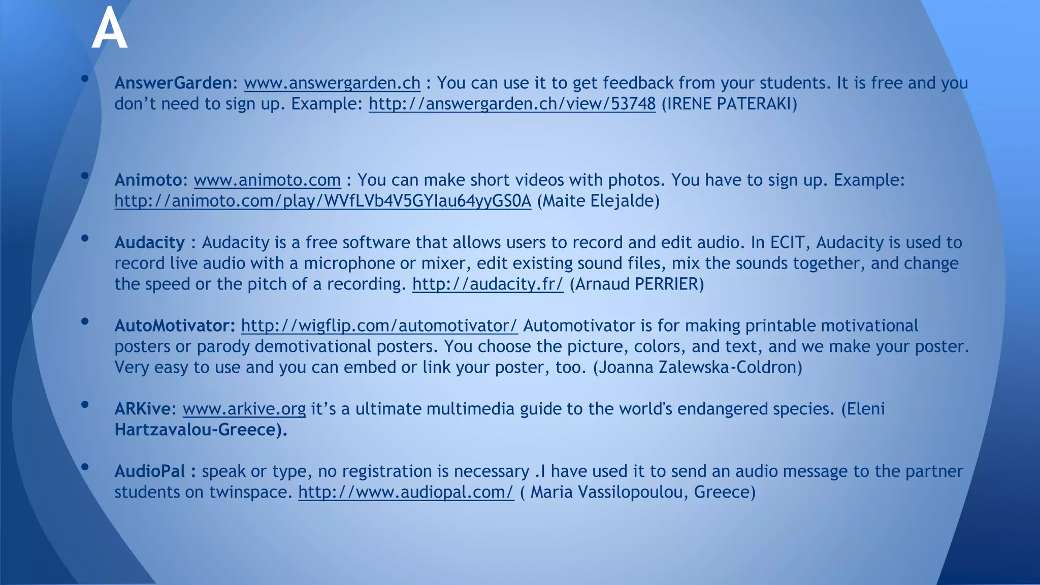 The document provides a comprehensive list of Web 2.0 tools recommended by participants for educational purposes. Tools range from feedback collection, video creation, audio editing, to blog and infographic development, including notable mentions like Animoto, Canva, and Google Drive. It highlights both the advantages and accessibility issues associated with some tools, emphasizing their applicability in various educational contexts.