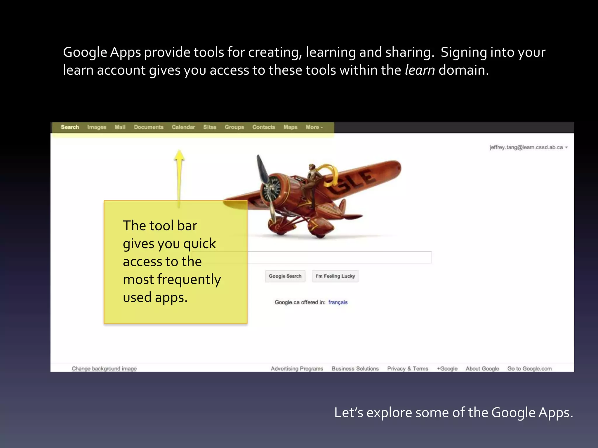 This document provides an overview of the Google Apps available to users with a learn account, including tools for creating documents, spreadsheets, presentations and drawings, as well as accessing email, calendar, sites, groups, contacts, maps, YouTube, news, books, photos and videos. Many of the apps allow for collaboration and sharing. The document encourages the user to explore the various apps available within the learn domain.