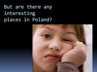Bolek and Lolek introduce themselves as popular cartoon characters from Poland who will show interesting places in their country. They discuss several notable cities and regions, including Warsaw, the capital; Krakow and its historic Wawel Castle; the seaside areas of Gdansk and Gdynia; the Tatras Mountains and ski resort of Zakopane; the Sudety Mountains; and Torun, birthplace of Copernicus. They highlight landmarks, history, and activities of each area to provide an overview of Poland's geography, culture, and attractions.