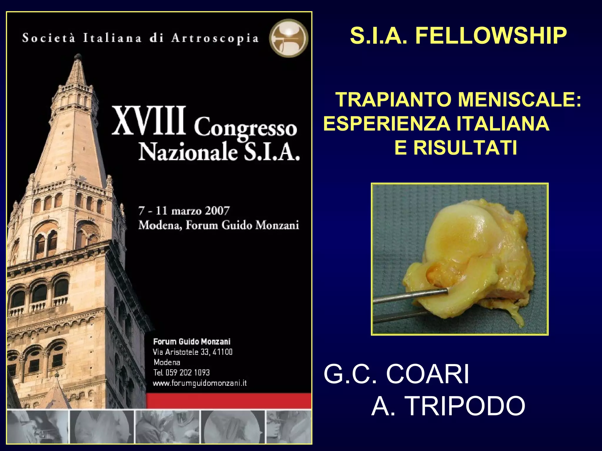 Il documento presenta un'analisi dell'esperienza italiana riguardo al trapianto di menisco, con un focus sui risultati clinici e le indicazioni per pazienti giovani con lesioni cartilaginee. I risultati evidenziano un alto tasso di soddisfazione dei pazienti e un miglioramento significativo della qualità della vita, con un follow-up che mostra risultati promettenti, soprattutto nei pazienti con meno danni condrali. Si sottolinea l'importanza di una corretta selezione dei pazienti e delle tecniche chirurgiche per garantire il successo dell'intervento.