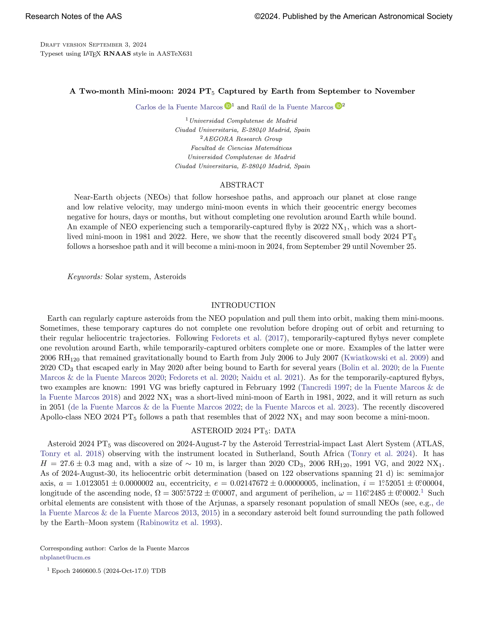 The document discusses the temporary capture of the near-Earth object (NEO) 2024 PT5, which is predicted to become a mini-moon around Earth from September 29 to November 25, 2024. It details the object's horseshoe trajectory and geocentric energy dynamics, indicating it will not complete a full orbit before resuming its heliocentric path. The research, which builds on previous studies of transient co-orbitals, highlights the significance of such events in understanding NEO interactions with Earth.