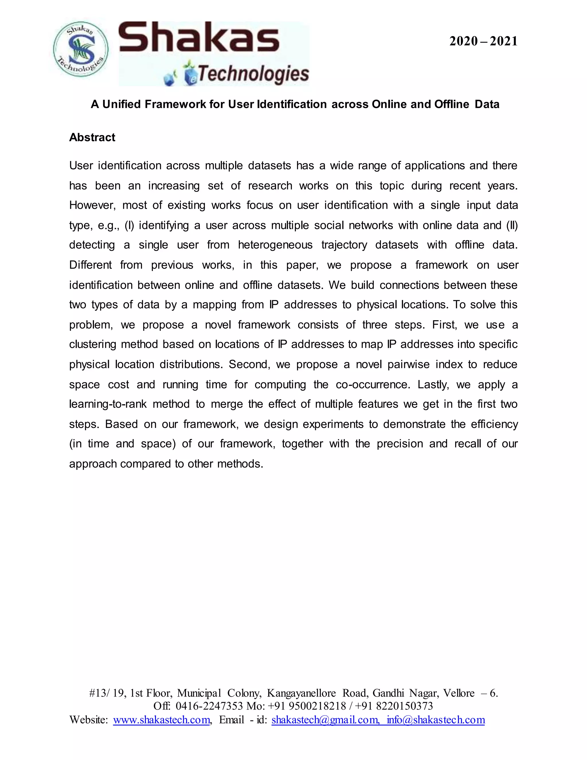 This document proposes a framework for user identification across both online and offline datasets. The framework consists of three steps: 1) Using clustering to map IP addresses to physical locations, 2) Developing a pairwise index to reduce space and time costs for computing co-occurrences, and 3) Applying a learning-to-rank method to merge effects of multiple features from the first two steps. The goal is to build connections between online and offline data types to identify users across different datasets. Experiments were designed to evaluate the efficiency and performance of the proposed framework.