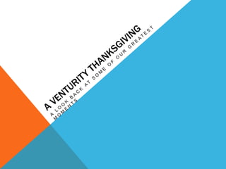 This document appears to be a collection of photos and captions from company events at Venturity. It references various teams and individuals at the company, photos from happy hours, meetings, sporting events and other gatherings. There are also some brief comments about the company culture emphasizing lifelong learning, service, integrity and an engaging work environment.
