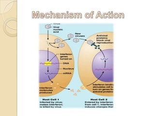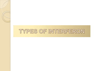Interferons are proteins naturally produced by cells in response to viral infections and other pathogens. They were discovered in 1957 by Alick Isaacs and Jean Lindenmann who found that a substance from infected chicken cells interfered with viral replication. There are three main types of interferons - alpha, beta, and gamma - which have similar but distinct mechanisms of action involving inducing antiviral genes. Interferons are now used clinically to treat hepatitis C, various cancers, and multiple sclerosis. Recombinant and pegylated versions of interferons have been developed to improve pharmacokinetics. Combination therapy with ribavirin is also commonly used.
