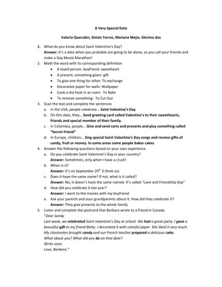 This document discusses Saint Valentine's Day traditions in different countries. In the USA, people celebrate Saint Valentine's Day on February 14th by sending greeting cards called valentines to their sweethearts, friends, and family. In Colombia, people give and send cards and presents and play a game called "Secret Friend." In Europe, children sing songs for Saint Valentine's Day and receive gifts like candy, fruit, or money, while some areas feature baked cakes. The document asks questions to compare traditions in one's own country to those in the USA and Colombia.