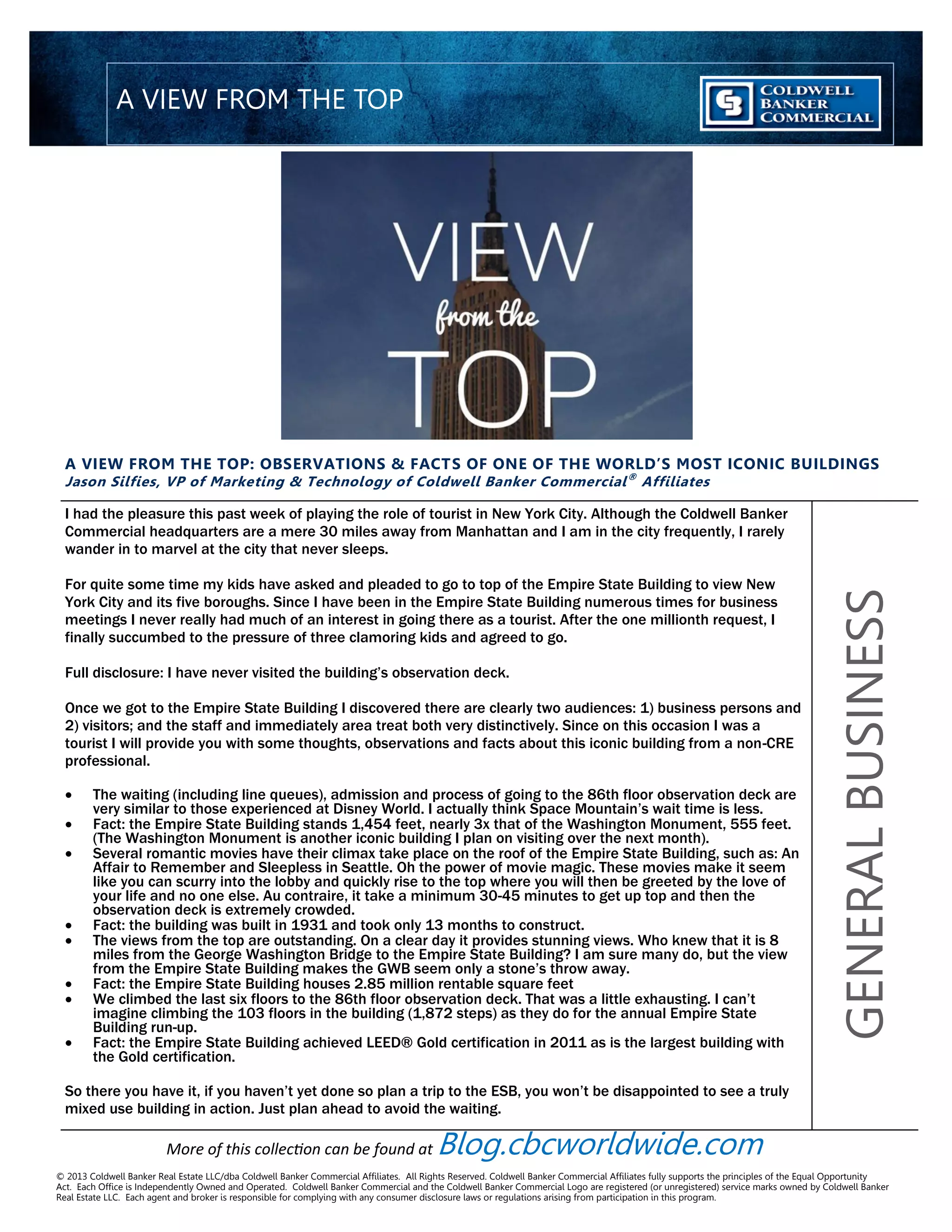 The VP of Marketing at Coldwell Banker Commercial took his family to visit the Empire State Building and shares his observations from touring the iconic landmark as a non-industry professional. He notes the long wait times similar to Disney World to reach the 86th floor observation deck. From the top, the views of New York City and surrounding areas are stunning. Some key facts about the building are that it stands 1,454 feet tall and was constructed remarkably quickly within 13 months. It also achieved LEED Gold certification, making it one of the largest buildings to receive this recognition.