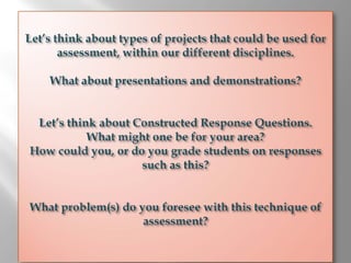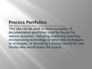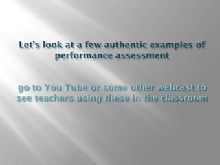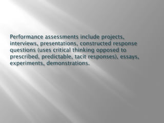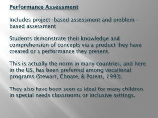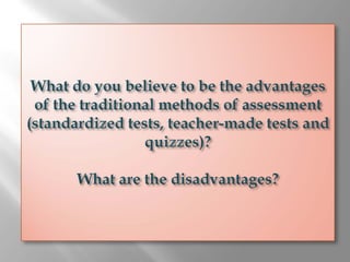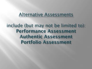 The document discusses alternative forms of assessment such as portfolios and authentic assessments. Portfolios can be either process-oriented to show student growth over time or product-oriented to showcase a student's best work. The document also discusses the advantages of alternative assessments, such as allowing students to apply concepts to real-life and engage in self-assessment. While these alternative assessments better prepare students for career growth, some disadvantages are that students may feel uncomfortable with new forms of evaluation.