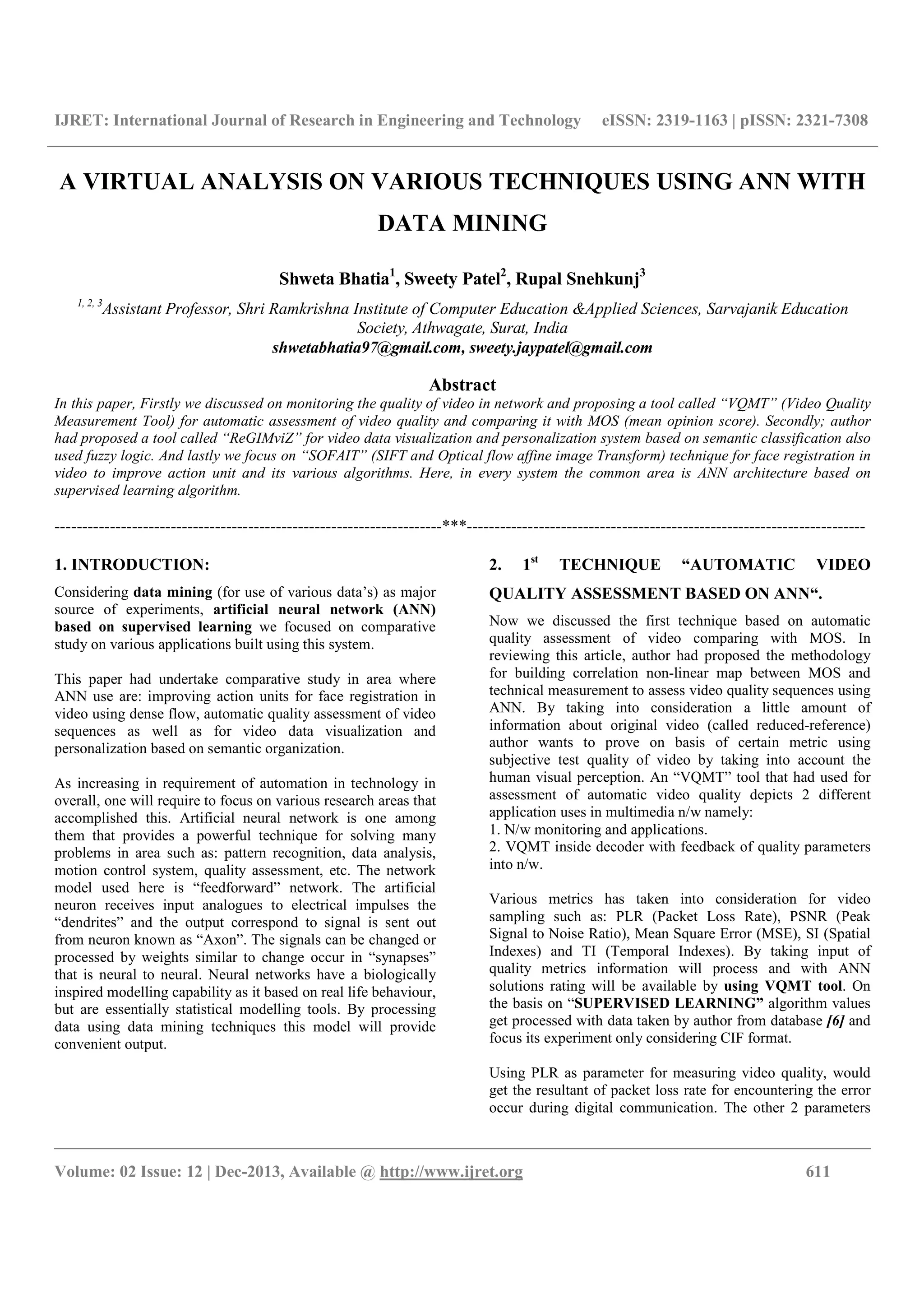 This document presents a comparative study on various applications of artificial neural networks (ANN) in video quality assessment, data visualization, and action unit recognition. It introduces three tools: VQMT for video quality measurement, Regimviz for interactive video data visualization, and Sofait for face registration in videos. The study emphasizes the role of supervised learning algorithms in enhancing automation in technology-related research areas.