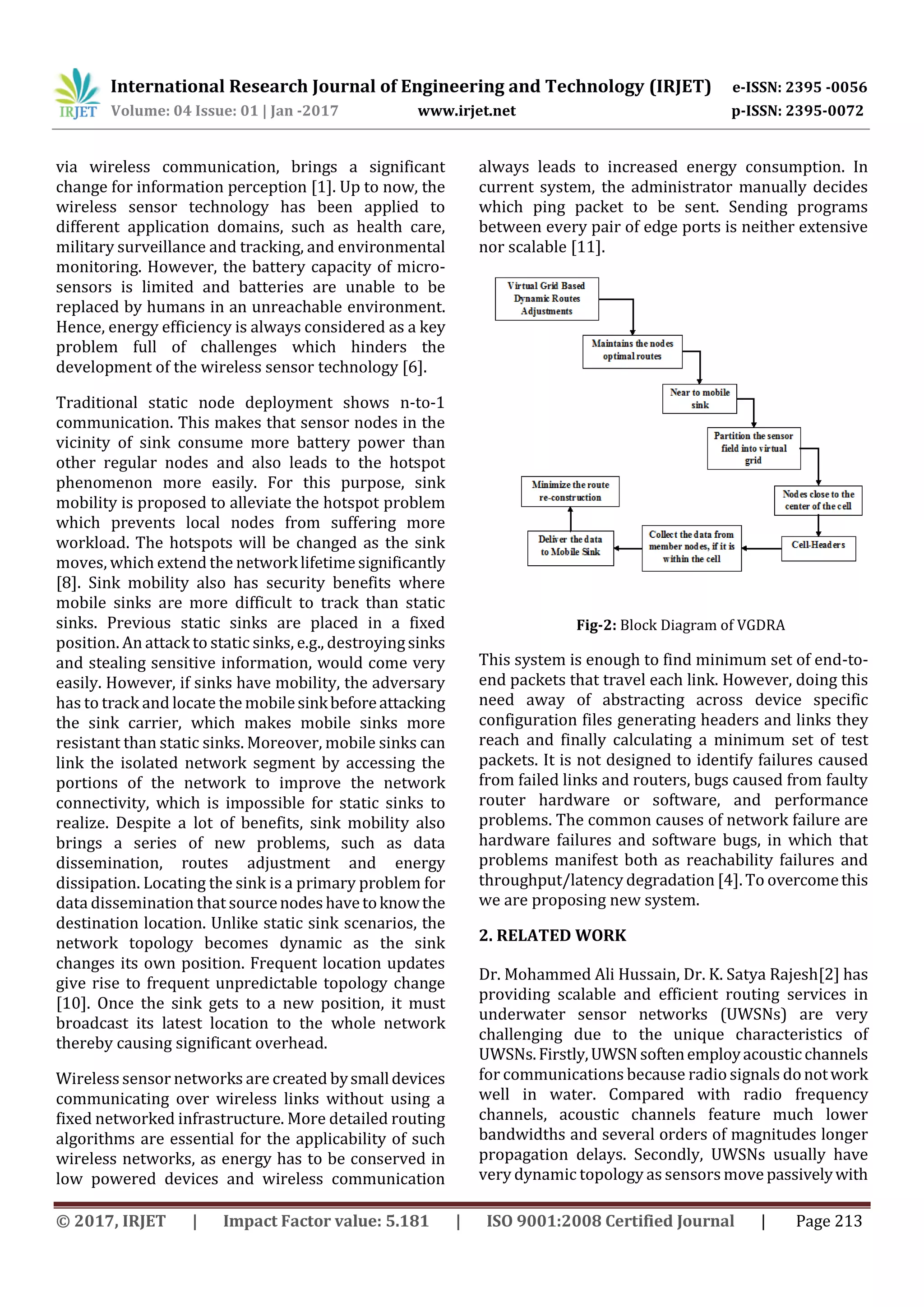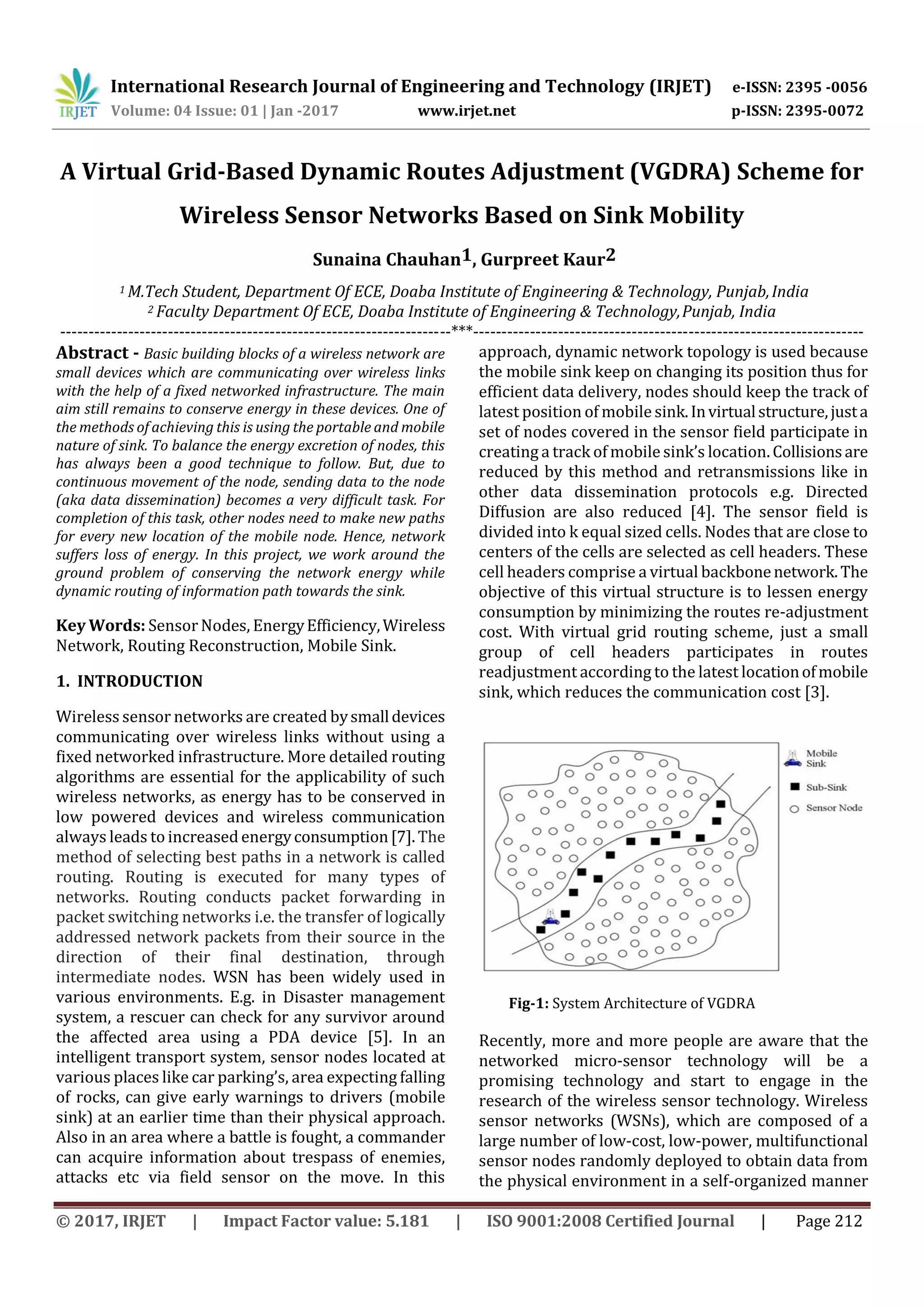This document presents a virtual grid-based dynamic routes adjustment (VGDRA) scheme for wireless sensor networks with a mobile sink. The scheme aims to conserve network energy while dynamically routing information towards the moving sink. It divides the sensor field into a virtual grid with cell header nodes. These cell header nodes participate in adjusting routes according to the latest location of the mobile sink, reducing communication costs and energy consumption compared to having all nodes participate. The VGDRA scheme balances energy expenditure of nodes and allows data to be efficiently disseminated to the mobile sink as it changes locations through dynamic routing reconstruction using the virtual grid structure.