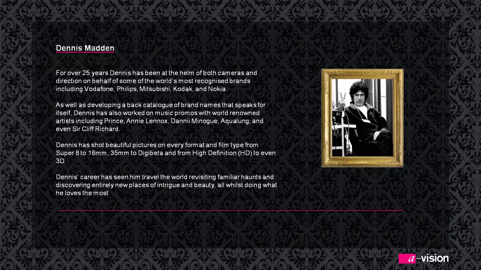 A-Vision produces award winning creative work across various mediums for clients, bringing together a talented team of directors, writers, and post-production specialists to deliver outstanding results on time and on budget. The document provides biographies of key members of A-Vision's team, including Andrew Smith, Laurie Castelli-Gair, and Paul Morgans, and includes examples of briefs and creative work produced for clients in various industries.