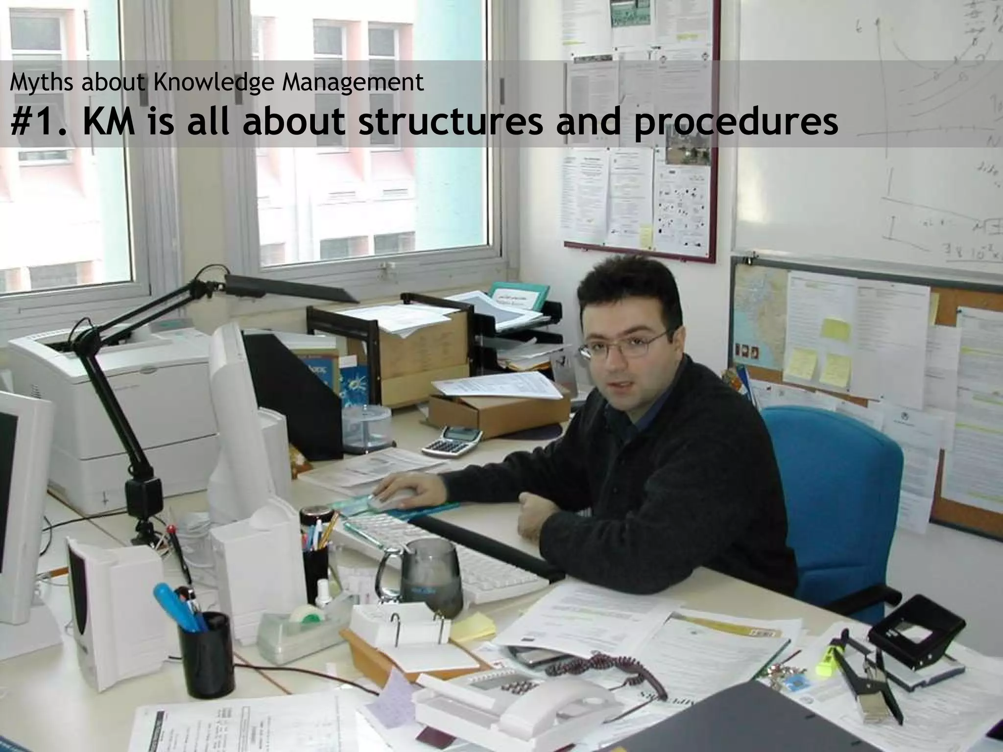 The document discusses several myths about knowledge management and provides a vision for effective knowledge management. It argues that knowledge management is not about structures and procedures or individual tasks, but about identifying, initiating, stimulating and managing knowledge processes. These knowledge processes include knowledge development, application, sharing, and transfer. The document presents a model for assessing the maturity of knowledge processes and provides examples of how optimized knowledge processes can provide benefits to organizations.