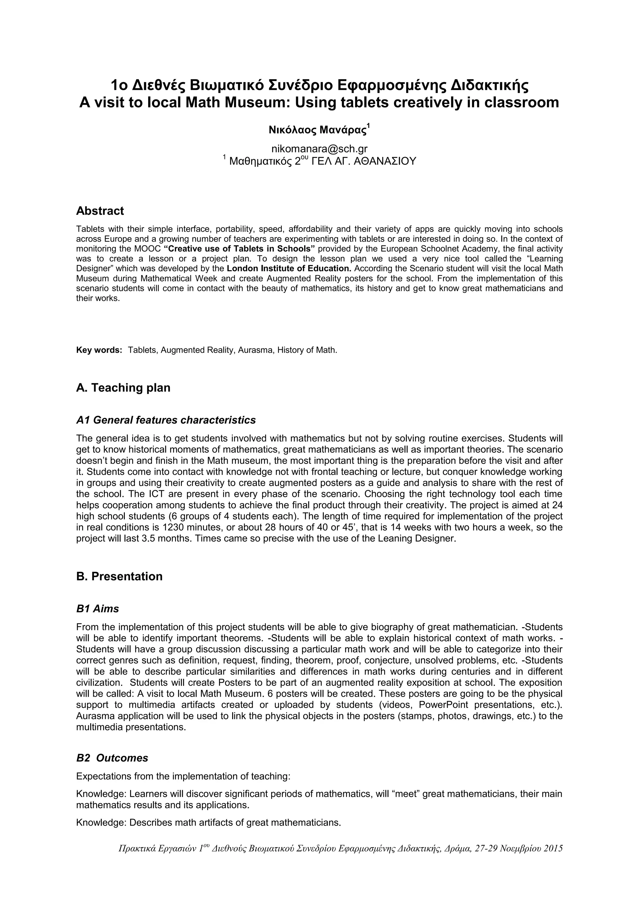 The document discusses a project plan for high school students to utilize tablets in a math museum visit, focusing on augmented reality and collaborative learning. Students will create posters about important mathematicians and theories, enhancing their understanding of math history through hands-on activities and digital tools. The project emphasizes constructivist principles and aims to develop student skills in research, teamwork, and creativity over a 3.5-month period.