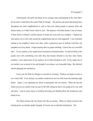 1) The author is reluctant to participate in her family's annual walk to raise money for hunger relief but feels guilty when her younger sister decides to take part.