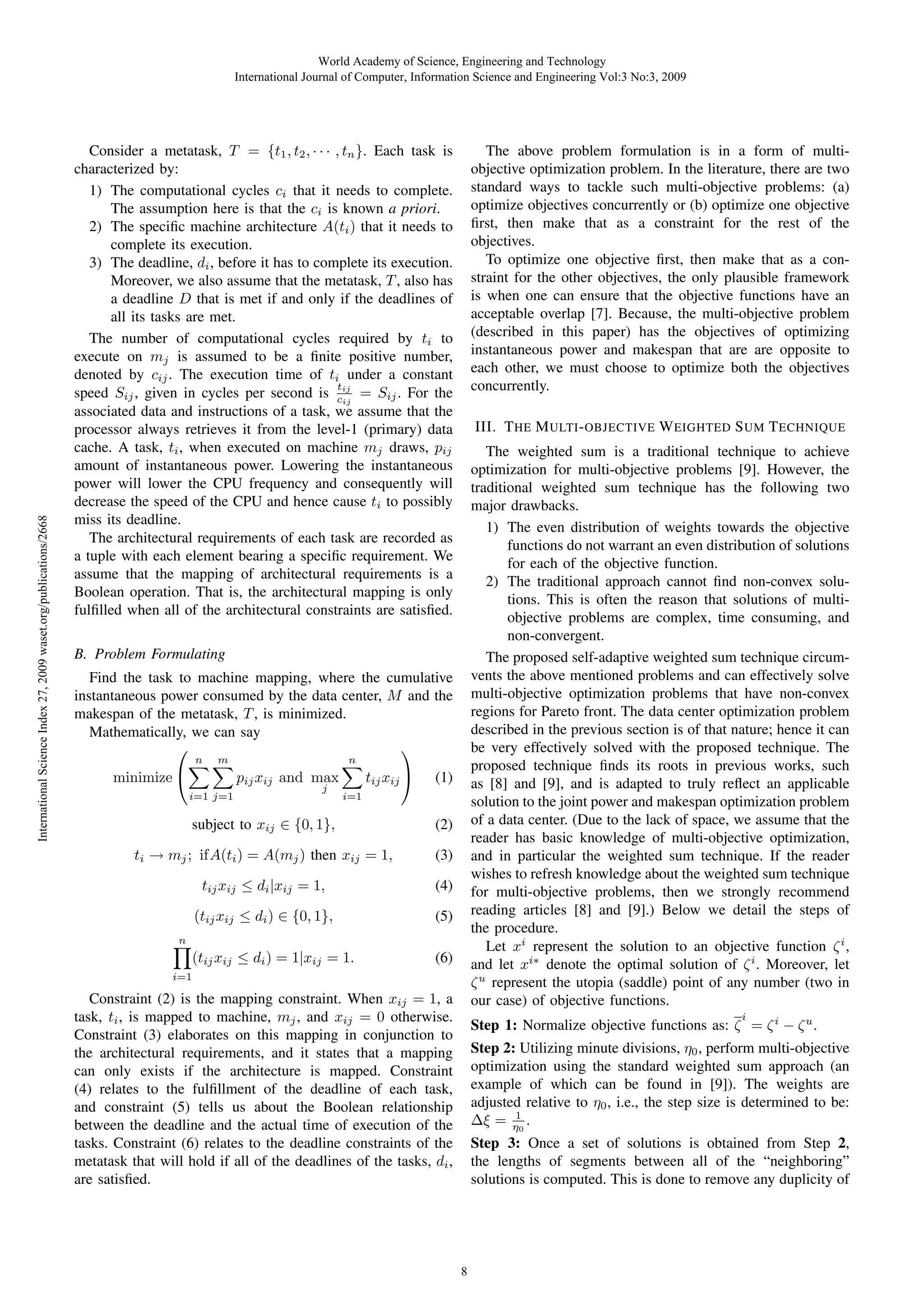 The document presents a self-adaptive weighted sum technique for jointly optimizing performance and power consumption in data centers. It formulates the problem as a multi-objective optimization to minimize total power consumption and task completion time. The proposed technique adapts weights during optimization to better explore non-convex regions of the solution space, unlike traditional weighted sum methods. It was tested on data from a satellite control network and showed improved results over greedy heuristics and competitive performance against optimal solutions for smaller problems.