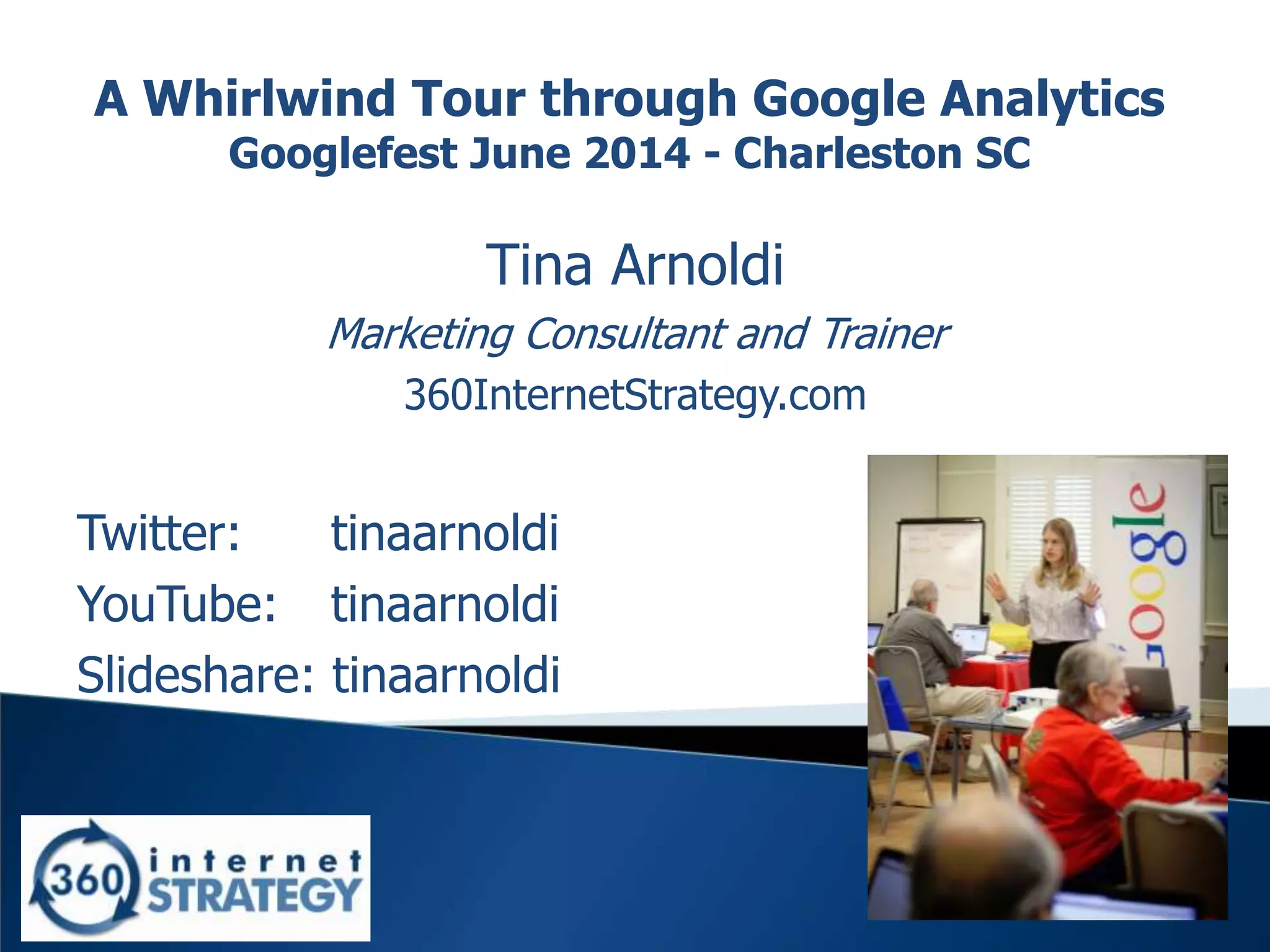 This document summarizes a presentation about using Google Analytics to analyze website traffic. It discusses how Google Analytics can be used to see which marketing efforts are working, track traffic patterns and trends, identify useful referral sources, see where people leave a site, and more. It also covers how to set up Google Analytics tracking, define goals, analyze mobile traffic, location data, and date ranges. Additional topics include linking Google Analytics to Google AdWords, using advanced segments, tagging campaigns, analyzing traffic sources, landing pages, social media, conversion funnels, and lowering bounce rates.