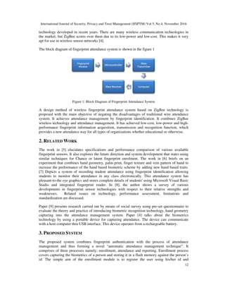This document describes a wireless fingerprint attendance system that was designed to automatically record student attendance using fingerprint identification. The system uses a fingerprint sensor module connected to a computer via a Zigbee wireless network. Students register their fingerprints initially. When attending a lecture, they place their finger on the sensor to be identified and have their attendance marked electronically and automatically. The system aims to eliminate the disadvantages of traditional paper-based attendance tracking systems. It provides a low-cost and efficient automatic solution for recording attendance.