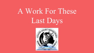The document outlines the Great Commission and emphasizes the role of Adventists in preaching the gospel, making disciples, baptizing, and healing. It highlights the importance of unity and faith among believers to hasten the second coming of Christ and warns against the consequences of unbelief and division. Additionally, it discusses practical methods for engaging others through health messaging and personal testimonies in missionary work.