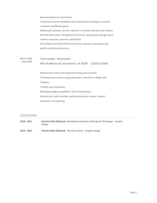 Amber Wright has nearly 10 years of experience in customer service roles, including as an operator for answering services and as a team leader at McDonald's. She has strong skills in software like Microsoft Office and Adobe Creative Suite as well as communication, problem solving, and creative thinking. Wright aims to help people through her work.