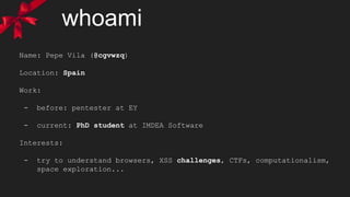 The document discusses a security challenge focused on exploiting XSS (Cross-Site Scripting) vulnerabilities across several PHP files (index.php, token.php, index2.php, index3.php). It details the author's approach, strategies, and outcomes while attempting to bypass anti-XSS measures and generate successful payloads for the challenge. Additionally, it includes snippets of code and ideas for effective exploitation techniques, emphasizing trial and error in the learning process.