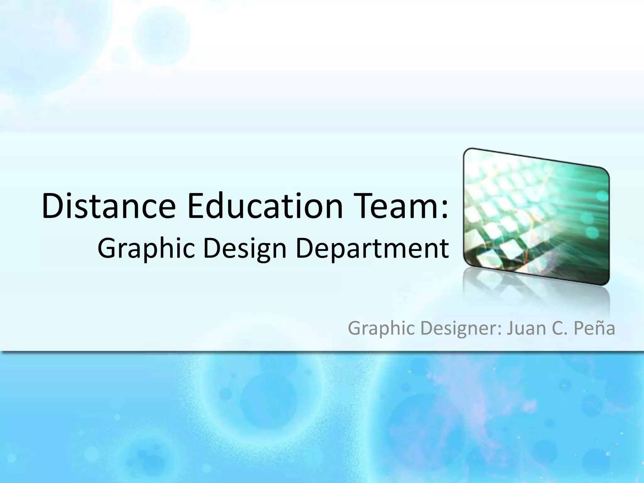The document outlines the various graphic design and web development projects led by graphic designer Juan C. Peña for the distance education team. It covers the creation of promotional materials, online course graphics, and the development of a custom distance education web page, including features like user-friendly interfaces and browser compatibility testing. Additionally, it mentions ongoing mobile development and efforts to migrate the webpage to a more manageable CMS platform.