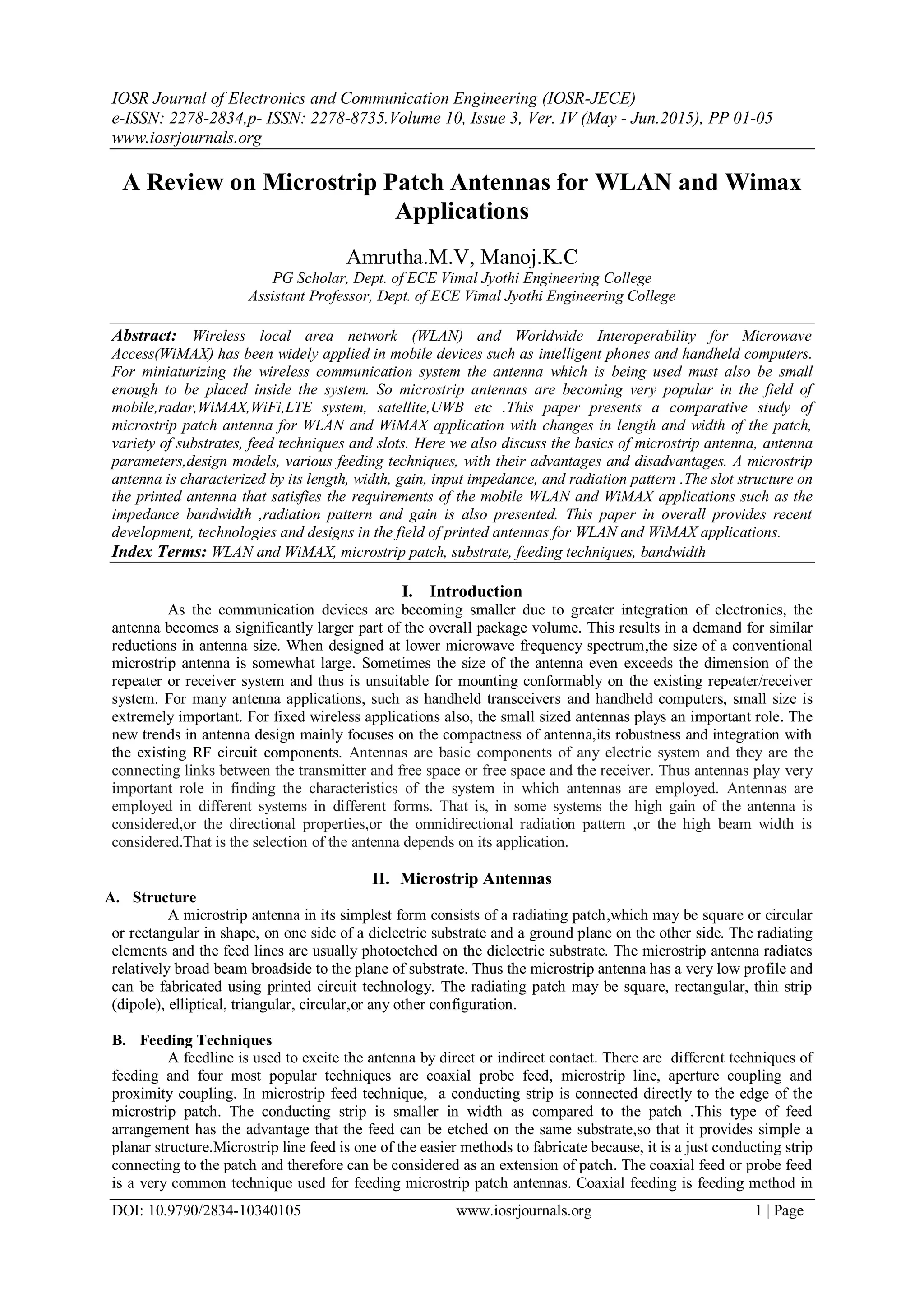 This document reviews microstrip patch antennas for WLAN and WiMAX applications. It discusses the basics of microstrip antennas including their structure, feeding techniques, advantages and disadvantages. Various methods for improving the bandwidth of microstrip patch antennas are examined, such as using different substrate materials and thicknesses or adding slots to the patch. A comparison table shows how the bandwidth changes with different substrate properties. The document concludes that substrate thickness and dielectric constant influence bandwidth, and techniques like slots can further improve it, making microstrip antennas well-suited for WLAN and WiMAX systems.
