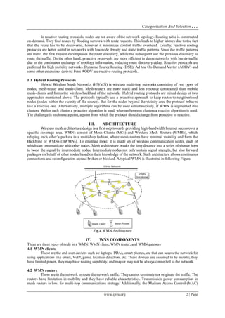 This document discusses the categorization and selection of routing protocols for wireless mesh networks (WMNs), highlighting the distinctions between proactive, reactive, and hybrid protocols. It emphasizes the importance of appropriate routing protocols to enhance the efficiency and reliability of WMNs in various applications, including broadband access and industrial automation. The analysis concludes that routing protocols should be distributed and capable of maintaining quality of service while adapting to the specific network conditions.