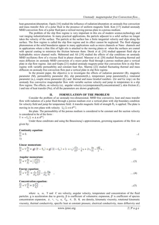 This document presents a study of unsteady magnetopolar free convection flow through a porous medium with radiation and variable suction. The governing equations for this problem are derived and solved using a series expansion method. Results are presented graphically showing the effects of various parameters like permeability, magnetic field, thermal Grashof number, and slip on velocity, angular velocity, temperature, concentration, skin friction, and heat transfer rate for the fluids air and water. Key findings include that decreasing thermal Grashof number decreases skin friction in air but increases it in water, and decreasing the temperature jump parameter increases the heat transfer rate.