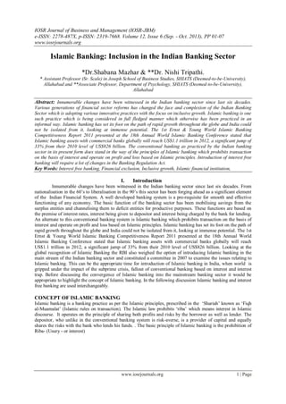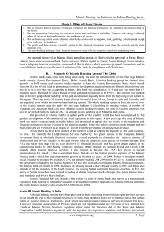 The document discusses the growing interest and potential for Islamic banking within the Indian banking sector, emphasizing the need for reform to integrate interest-free banking principles. It highlights global trends in Islamic finance, showcasing its significant growth and acceptance in various markets, and notes the regulatory challenges faced by Islamic banking in India due to existing banking laws that favor interest-based transactions. The paper suggests that with increasing awareness and demand among consumers, Islamic banking could play a crucial role in promoting financial inclusion in India.