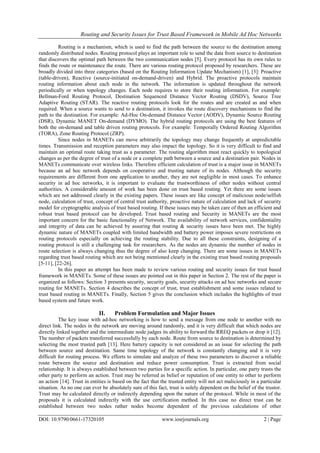 This document discusses routing and security issues for trust-based frameworks in mobile ad hoc networks (MANETs). It begins by defining MANETs and explaining that routing protocols play an important role in discovering optimal paths between nodes. However, the dynamic and unpredictable nature of MANETs makes routing difficult. The document then examines security issues for MANETs including attacks from malicious nodes. It argues that establishing trust between nodes is important for routing and security. However, existing trust-based routing proposals have issues that are not clearly addressed, such as how to calculate and establish trust between nodes. The document concludes by stating that addressing these open issues could help develop more efficient and robust trust-based routing protocols for MANETs.