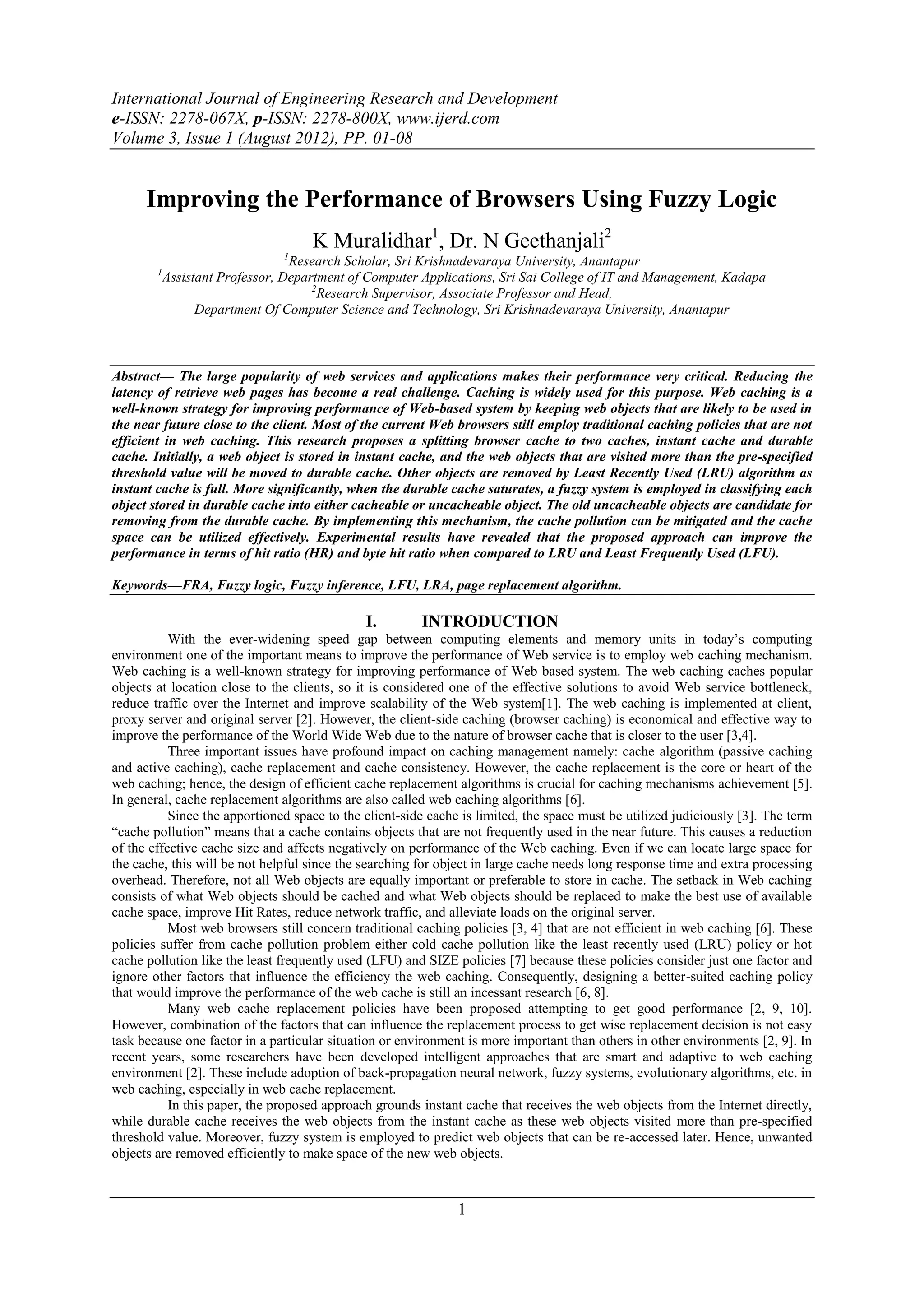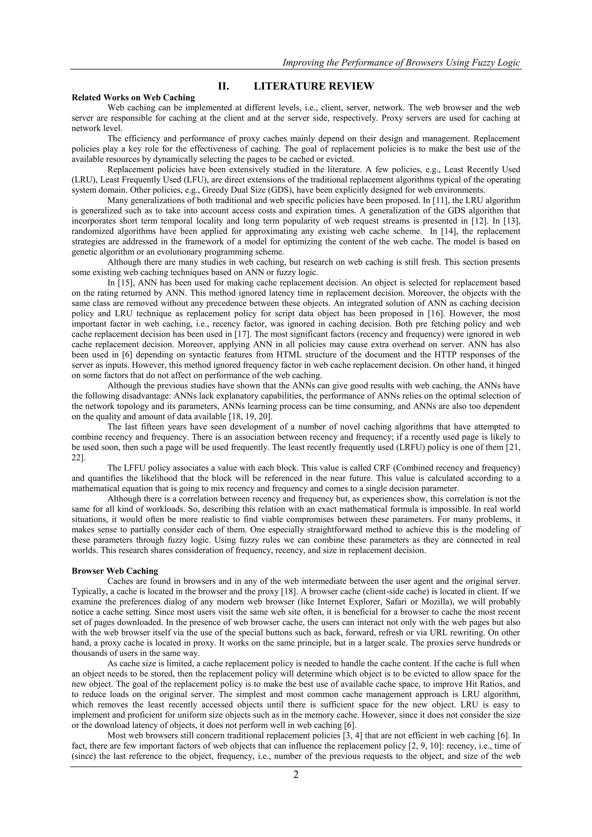 The document proposes a framework for improving browser performance using fuzzy logic. It splits the browser cache into an instant cache and durable cache. Web objects are initially stored in the instant cache, and objects visited more than a threshold are moved to the durable cache. When the durable cache is full, a fuzzy system classifies each object as cacheable or uncacheable. Uncacheable objects are removed to make space for new objects. The fuzzy system considers factors like recency, frequency and size to determine cacheability. Experimental results showed this approach improved hit ratio and byte hit ratio compared to LRU and LFU caching policies.