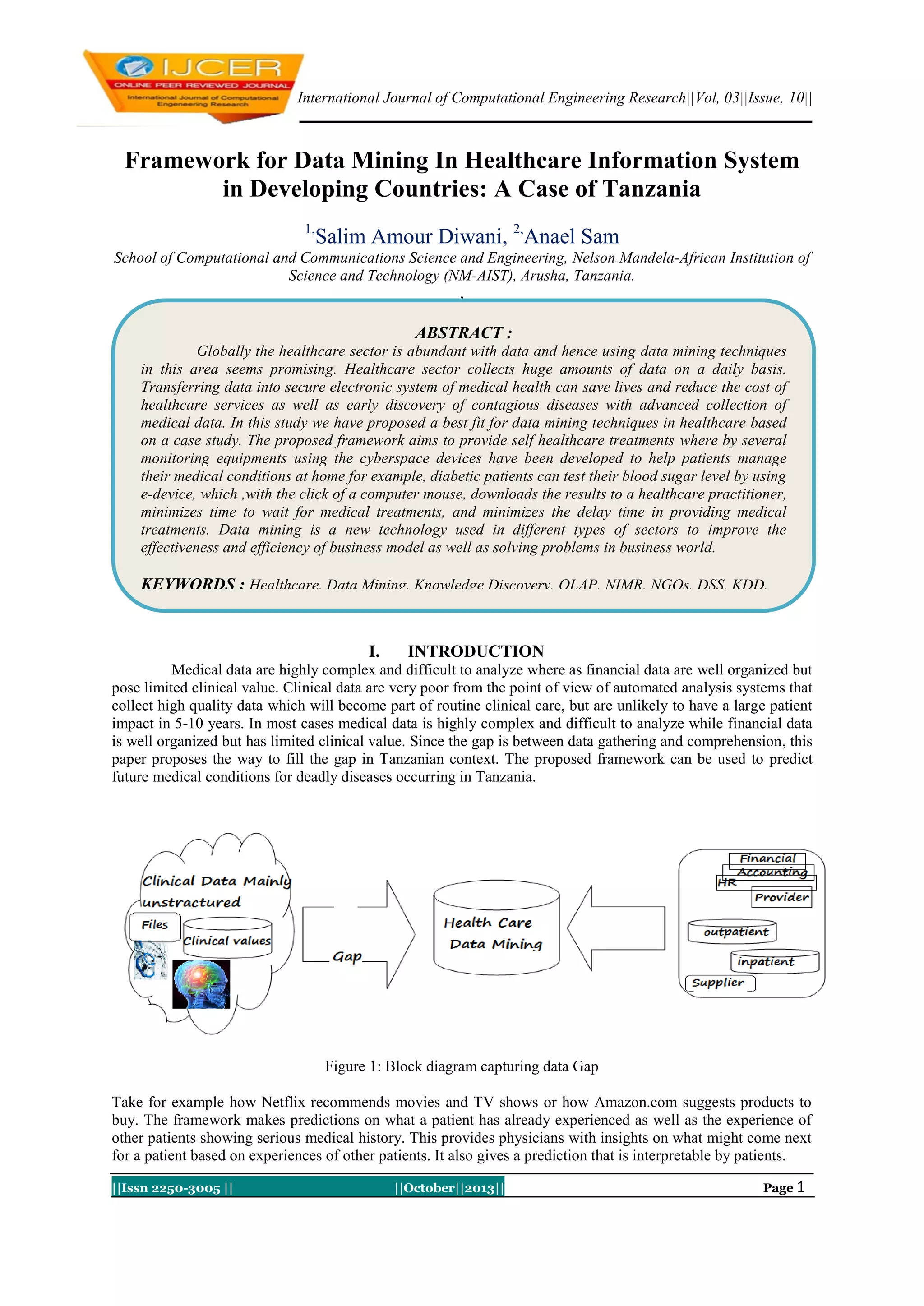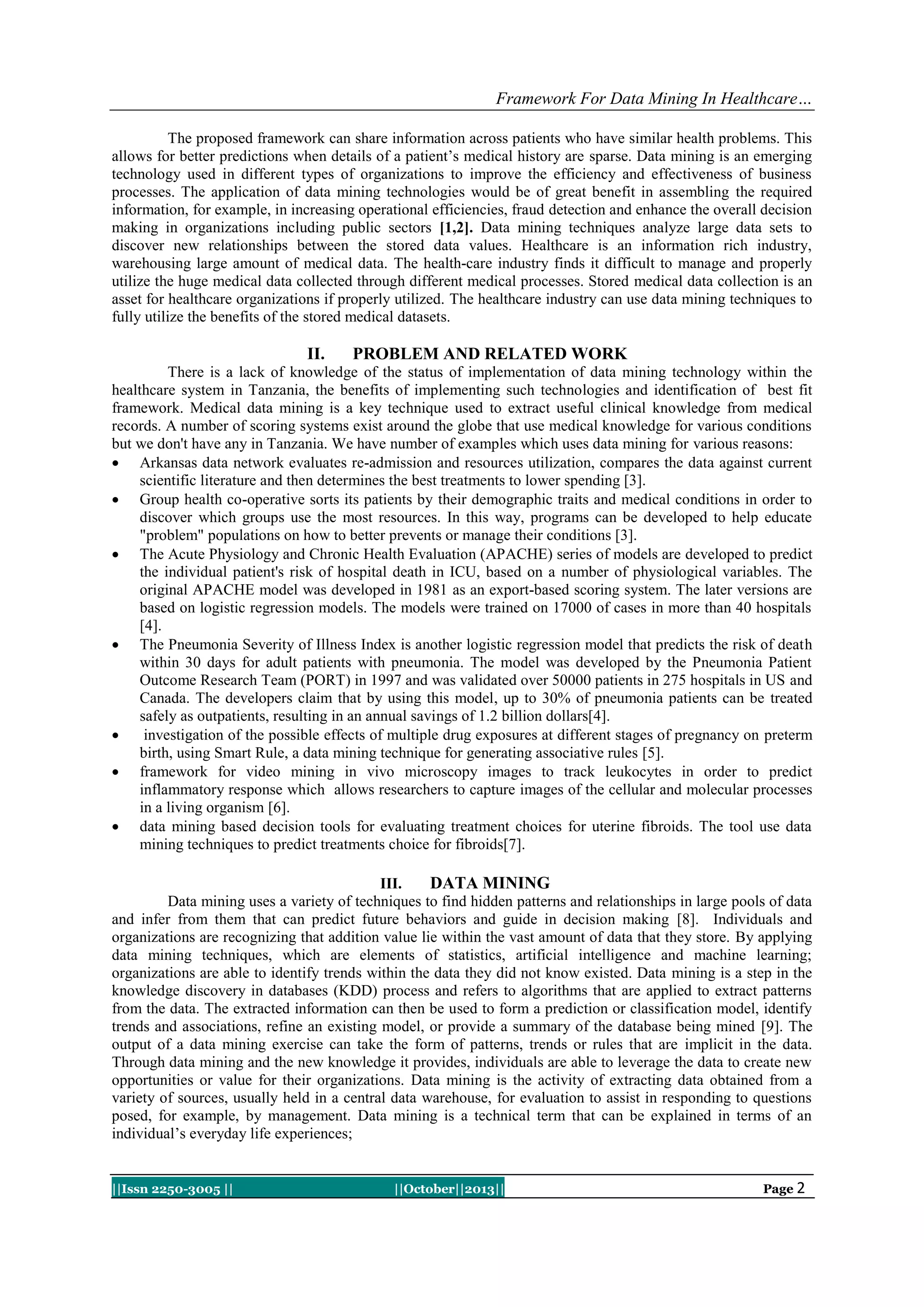 This document proposes a framework for data mining in the healthcare information system of Tanzania, aiming to improve efficiency and predict medical conditions based on collected data. It highlights the potential benefits of data mining such as enhancing patient care, reducing costs, and improving relationships between patients and physicians, while also addressing the challenges in implementing such a system. The framework emphasizes the need for better data management, clinical data exchange standards, and decision support systems to advance healthcare in the region.