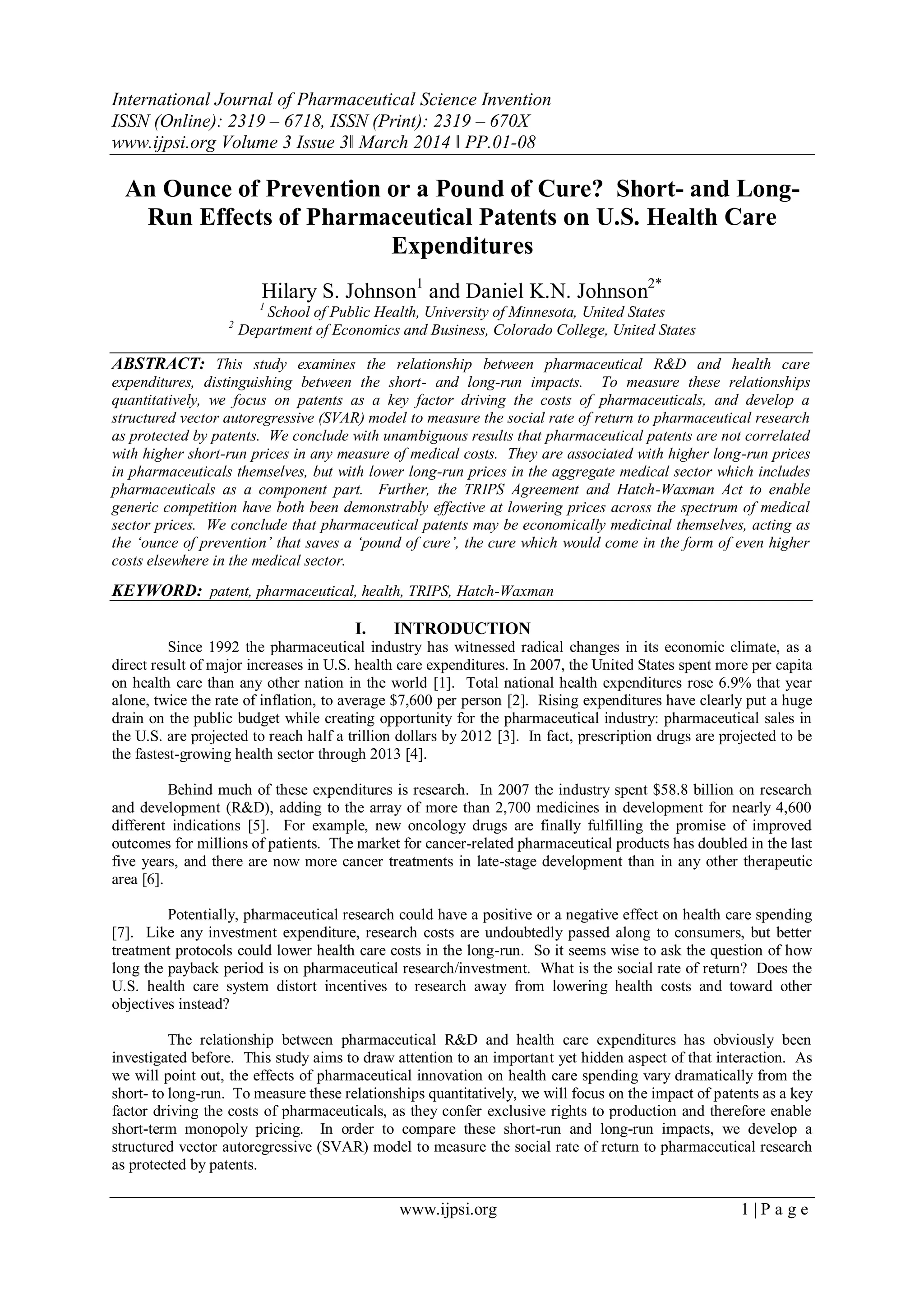 This study investigates the impact of pharmaceutical patents on U.S. health care expenditures, differentiating between short- and long-run effects. It finds that while patents do not correlate with higher short-run medical costs, they may increase long-run pharmaceutical prices, although overall medical sector costs decrease due to generic competition. The analysis emphasizes that pharmaceutical patents can serve as a preventative measure that ultimately reduces overall health care expenses.