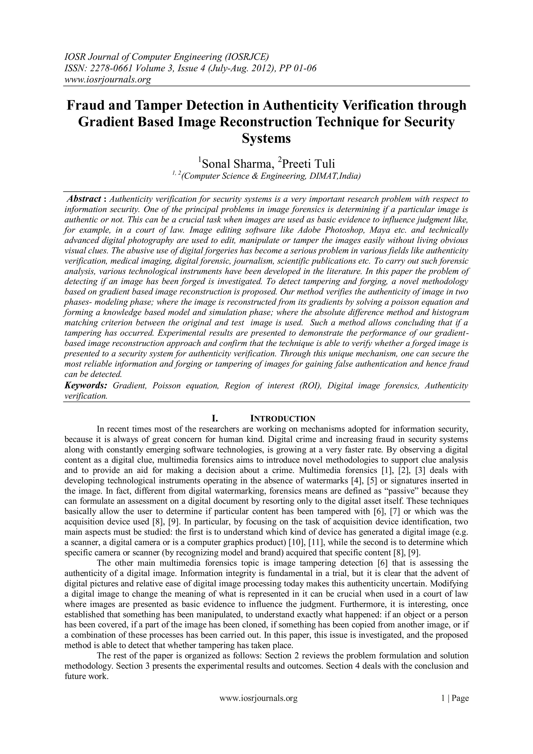 The document discusses a gradient-based image reconstruction technique for detecting fraud and tampering in authenticity verification systems. It involves a two-phase approach: 1) A modeling phase where the original image is reconstructed from its gradients by solving a Poisson equation to form a knowledge base model. 2) A simulation phase where the absolute difference between an original and test image is used along with histogram matching to determine if tampering occurred. Experimental results on original and reconstructed images demonstrate the technique can verify authentic image authenticity and detect tampering or forgeries aimed at gaining false authentication.