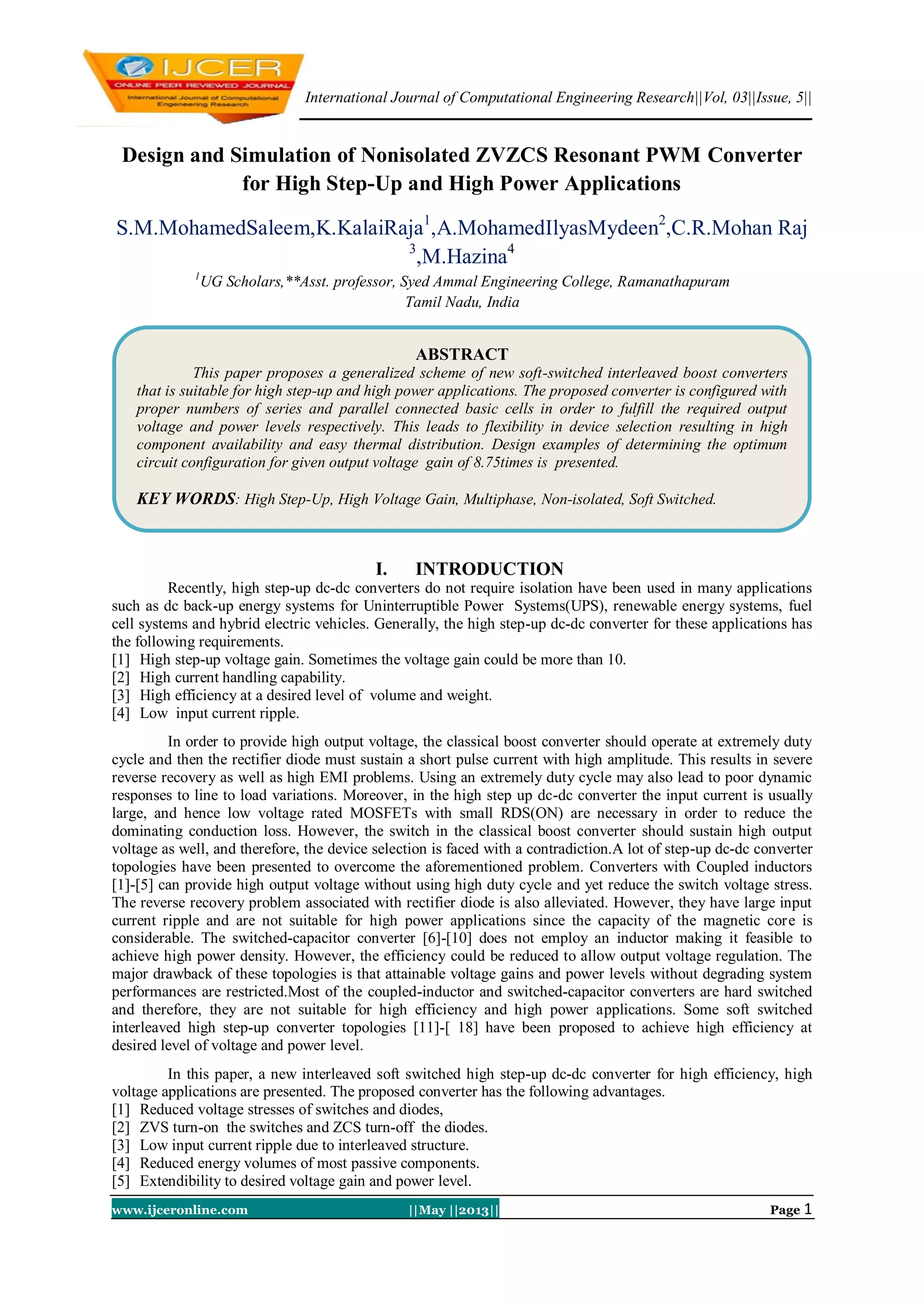 The document summarizes a proposed non-isolated ZVZCS resonant PWM converter for high step-up and high power applications. The proposed converter uses an interleaved structure of basic cells connected in series and parallel to achieve flexibility in device selection. It allows soft-switching turn-on of switches via zero-voltage switching and turn-off of diodes via zero-current switching through the use of an auxiliary circuit. Simulation results are provided to validate the converter's operation and advantages over conventional hard-switched converters, such as reduced switch voltage and current stresses leading to higher efficiency.