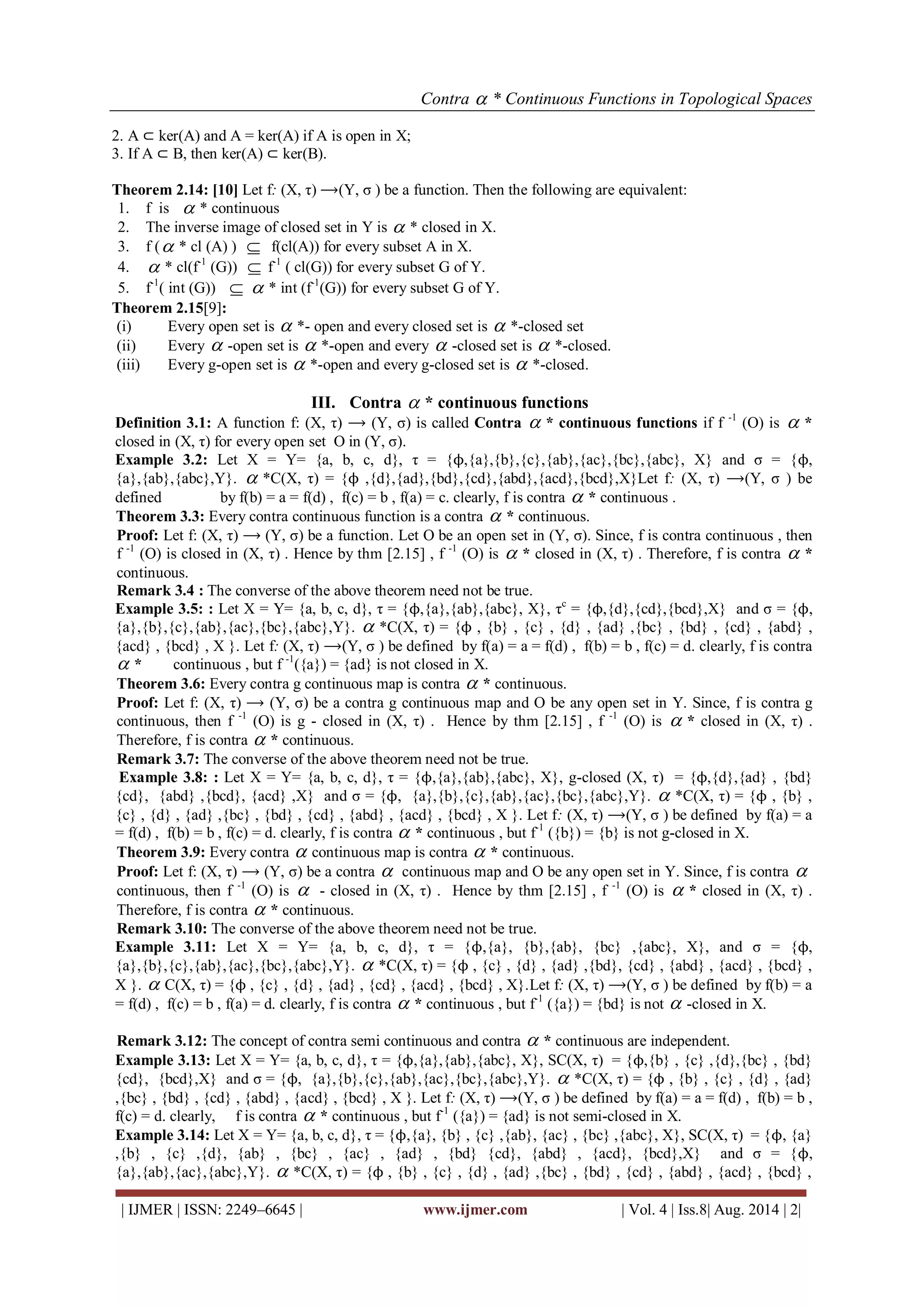 This document discusses contra α* continuous functions between topological spaces. It begins by introducing α*-open sets and various related concepts like α*-continuity. It then defines a function from one topological space to another to be contra α*-continuous if the preimage of every open set is α*-closed in the domain space. Some properties of contra α*-continuous functions are established, including that every contra-continuous function is contra α*-continuous. Examples are given to show the concepts are independent. The discussion considers the relationships between contra α*-continuity and other variations of contra-continuity.
